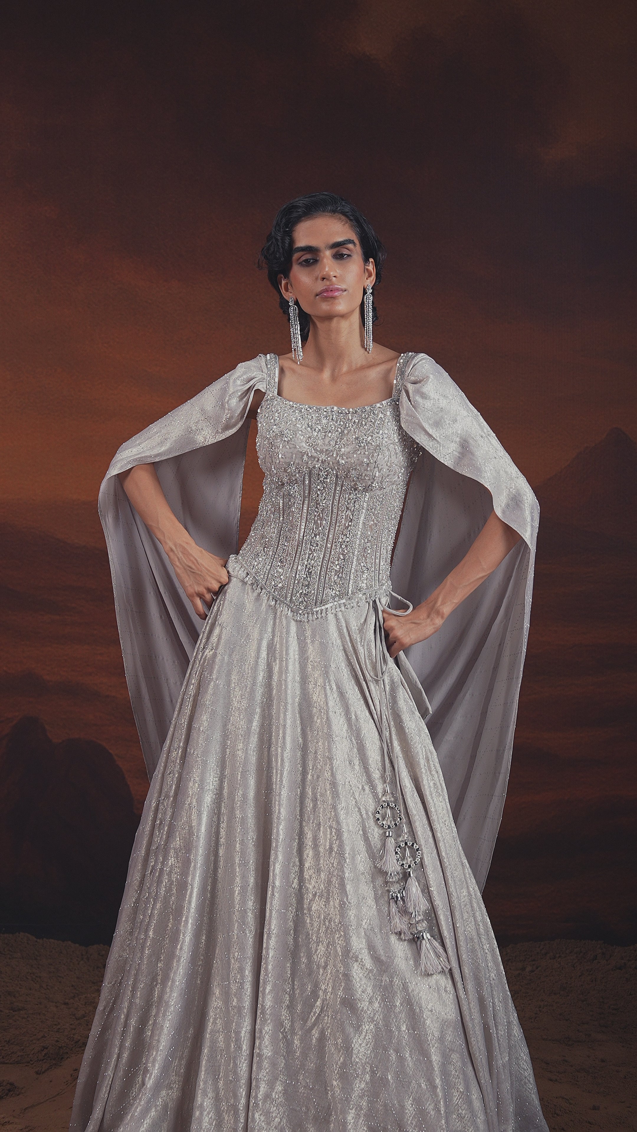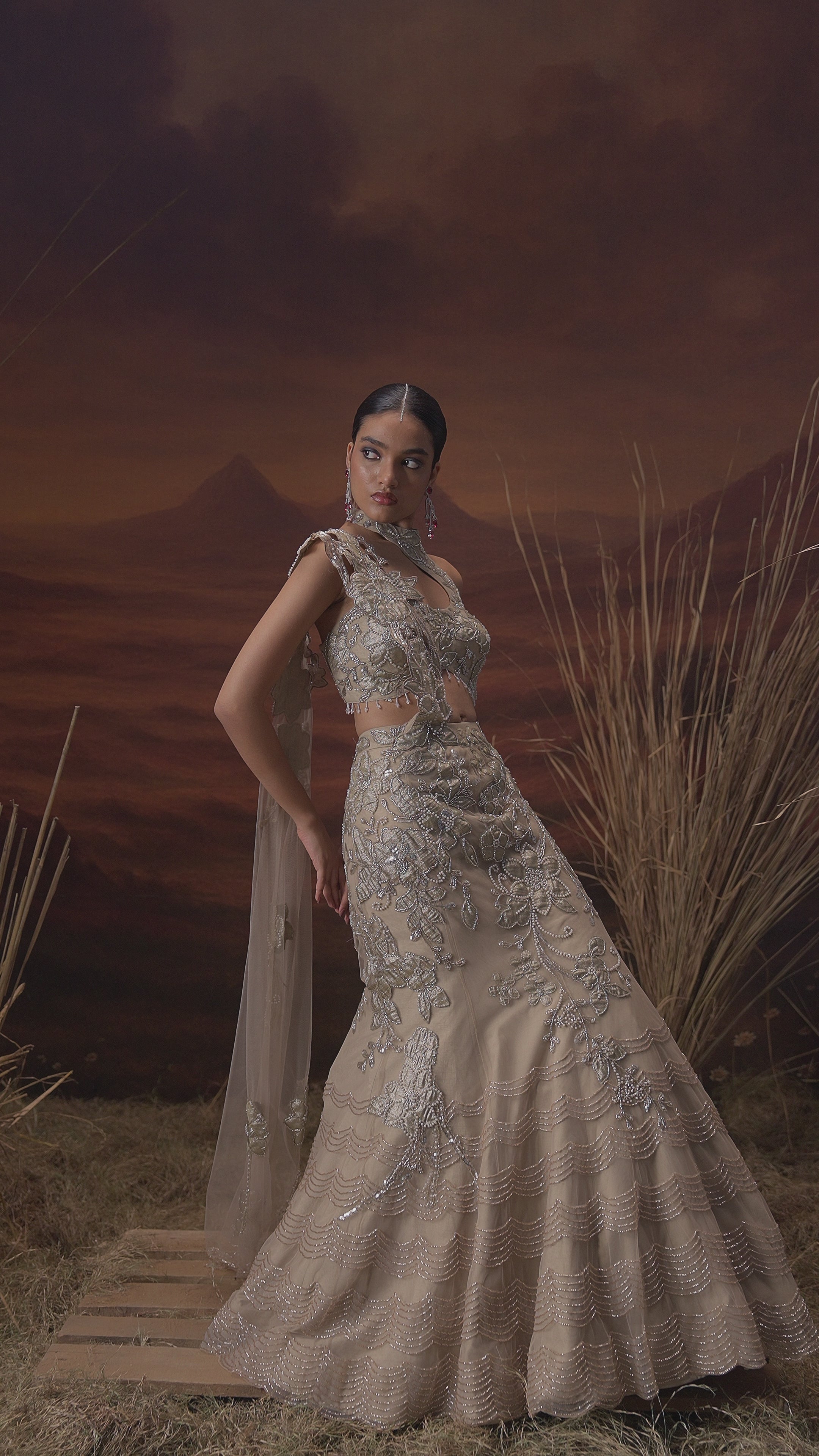 Champagne Silver Embellished Raw Silk Silk Lehenga Set