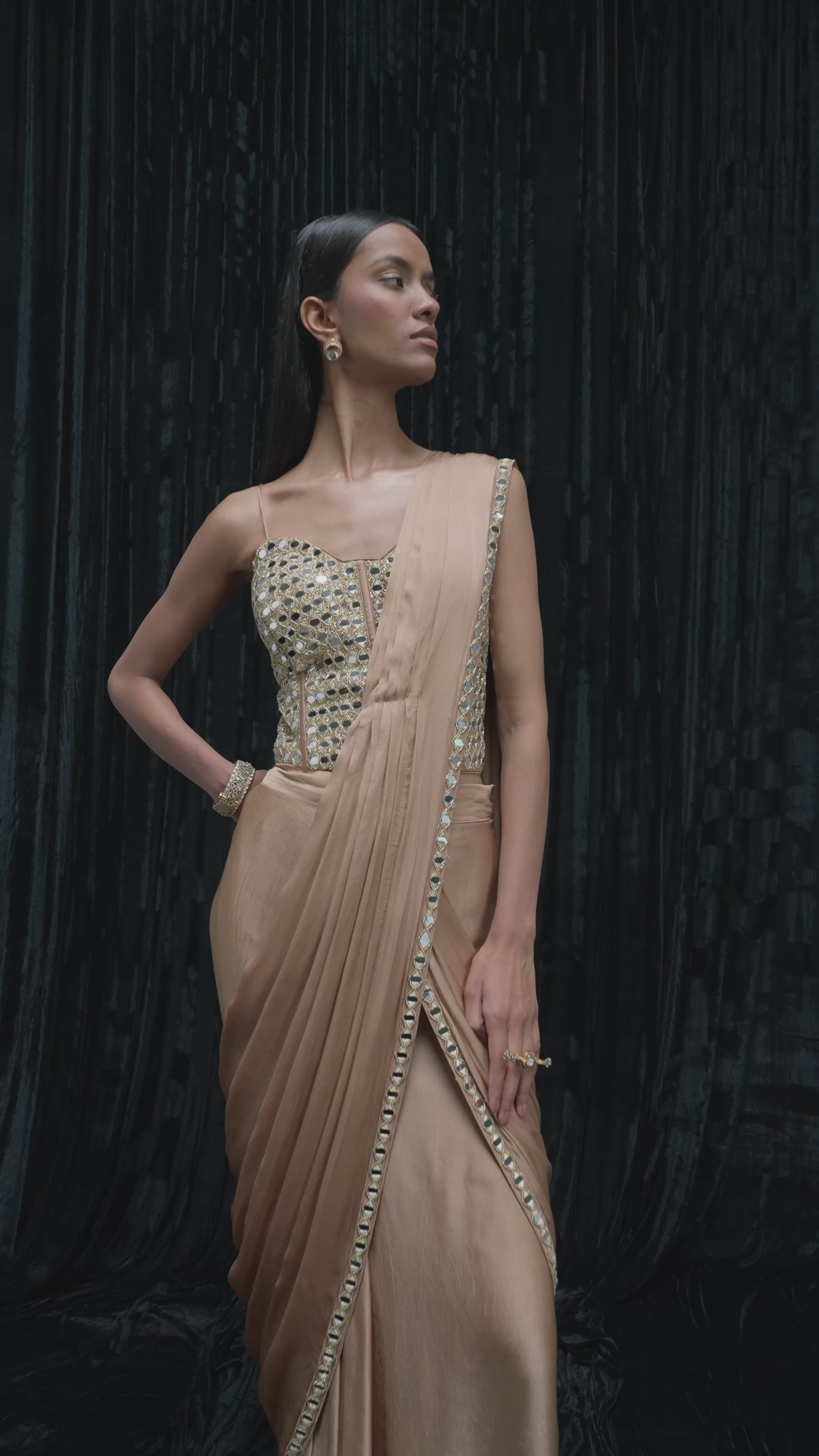 Champagne Beige Embellished Satin Silk Drape Skirt With Jacket