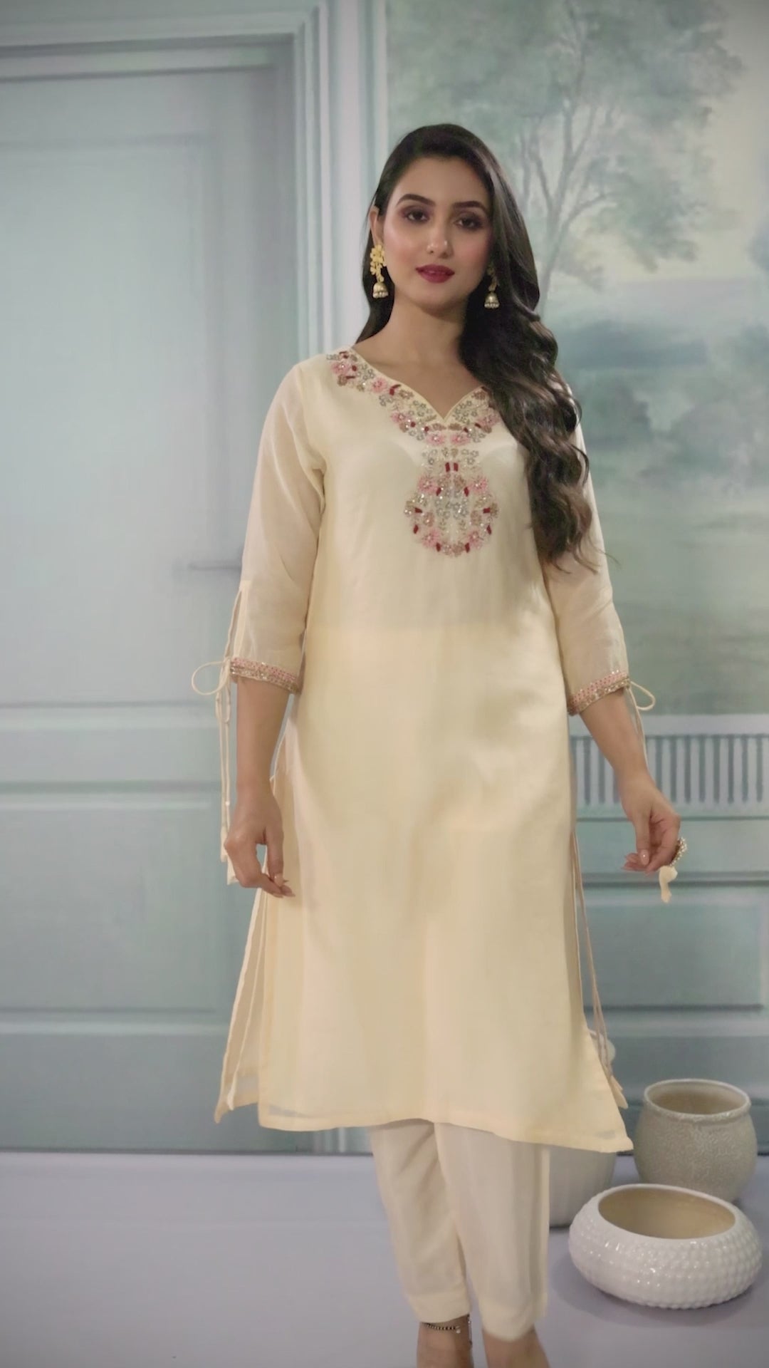 Cream Handwork Mul-Chanderi Silk Kurta Pants Set