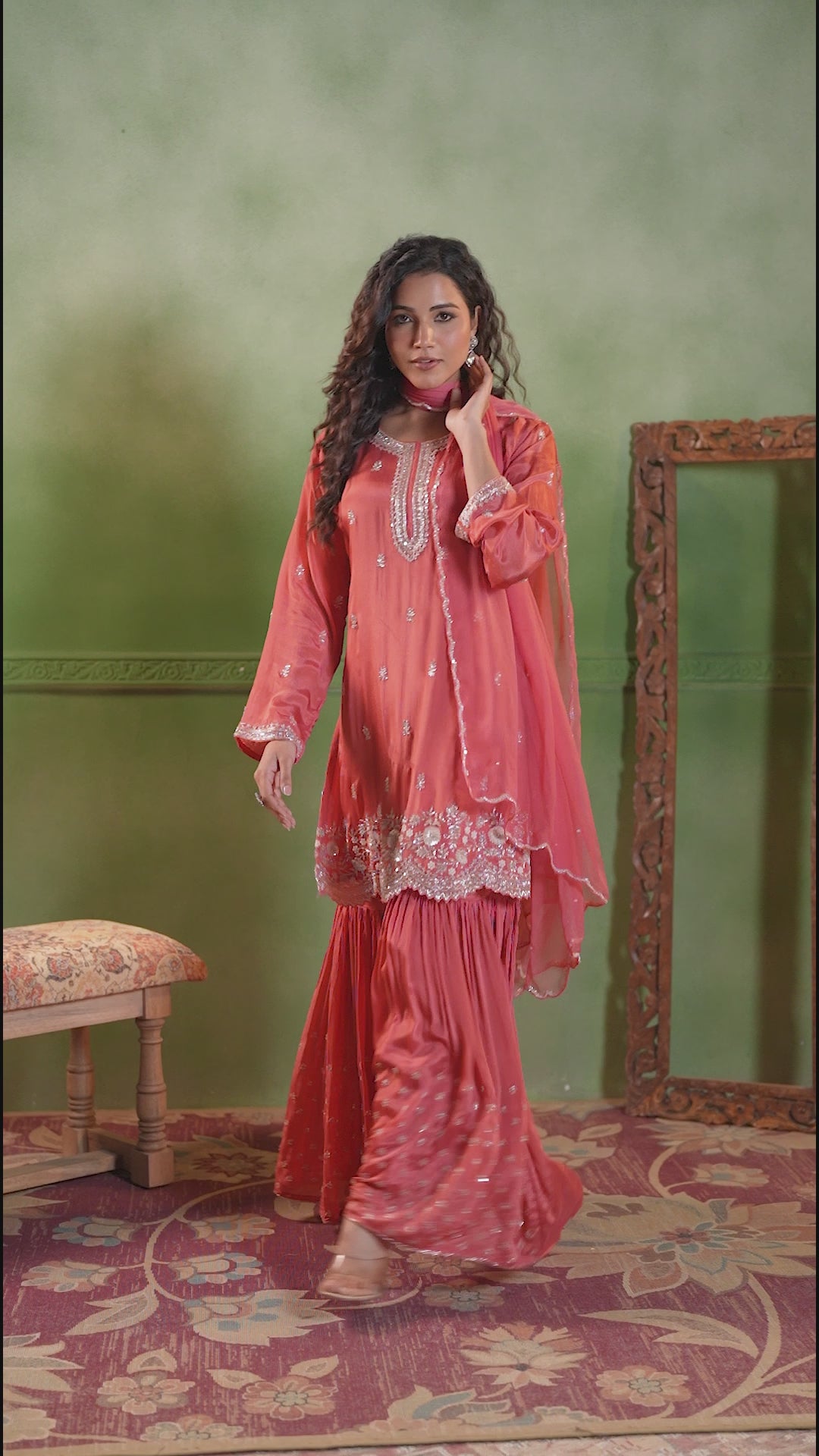 Coral Orange Embellished Georgette Silk Palazzo Set