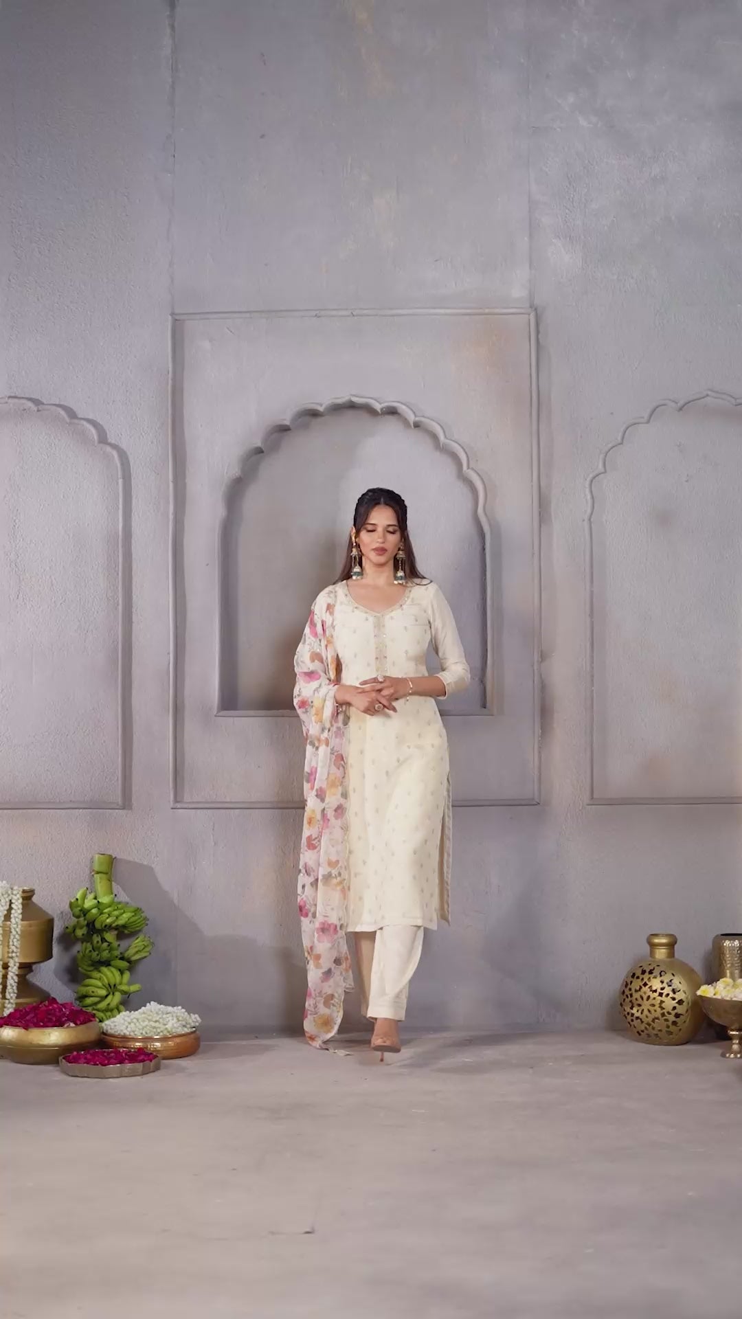 Cream White Embellished Dola Silk Pant Set
