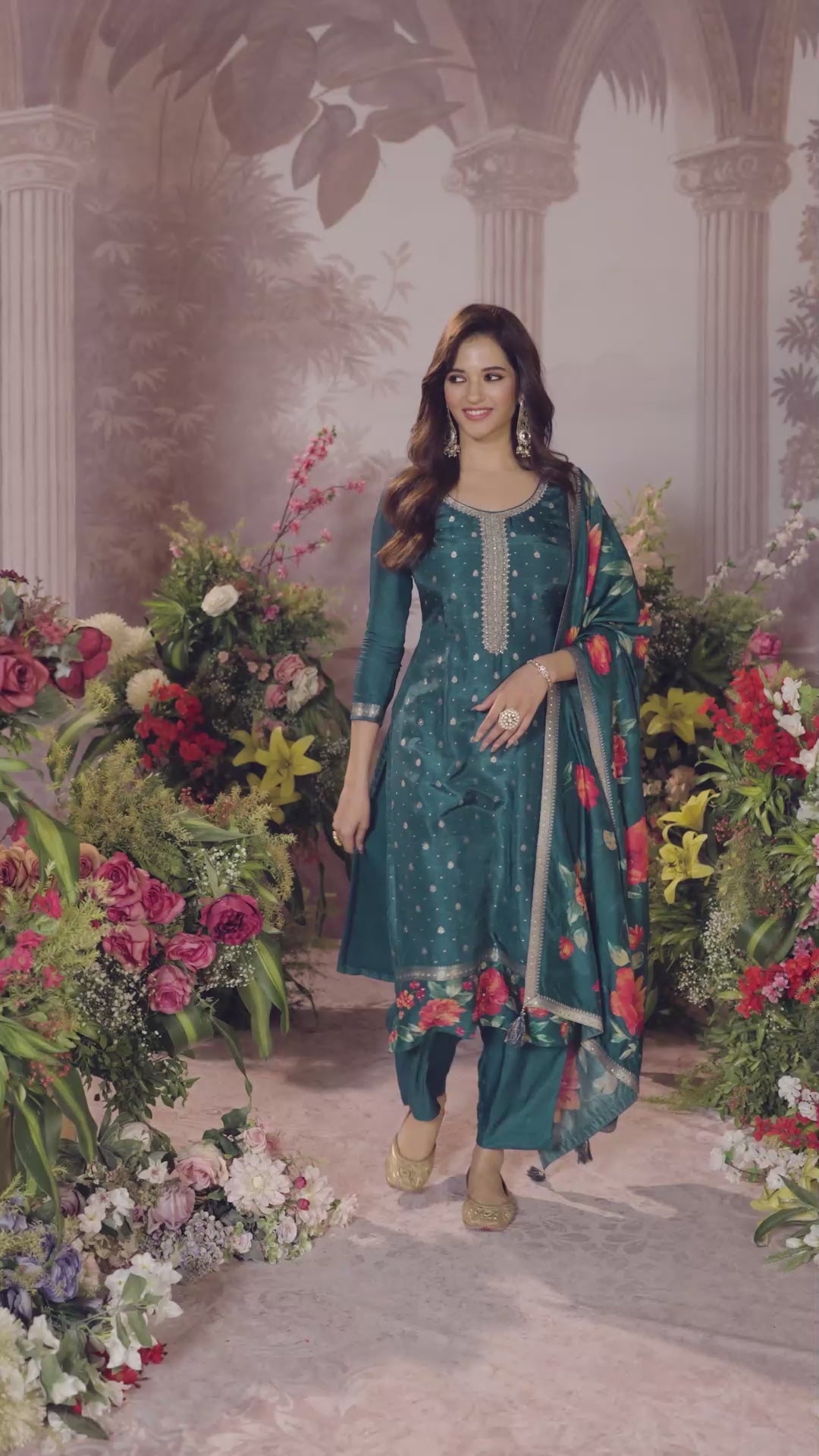 Deep Teal Embroidered Raw Silk Kurta & Palazzo Set