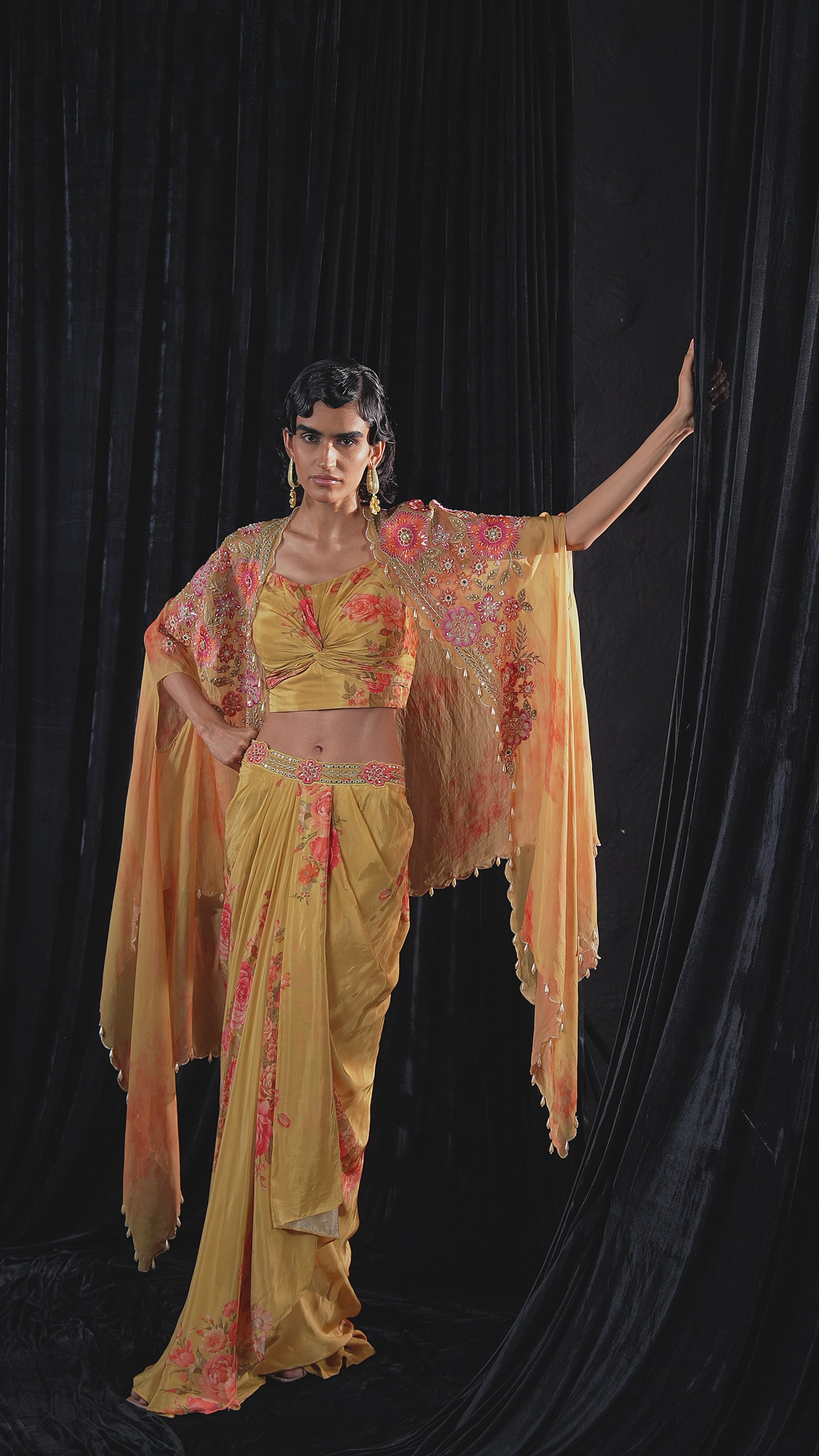 Golden Yellow Embellished Crepe Silk Drape Skirt Set