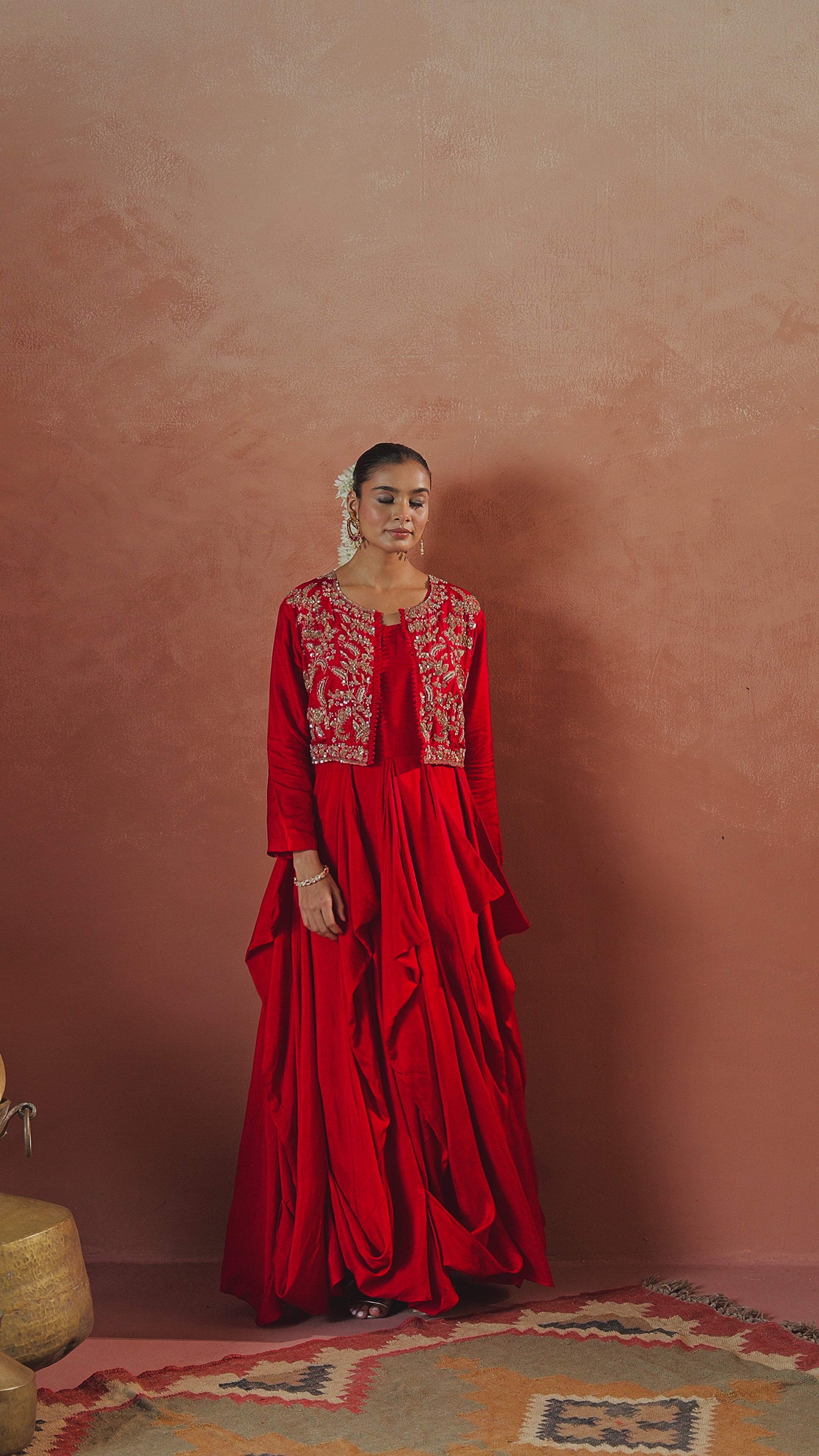Hot Red Embellished Premium Net Shrug & Palazzo Set