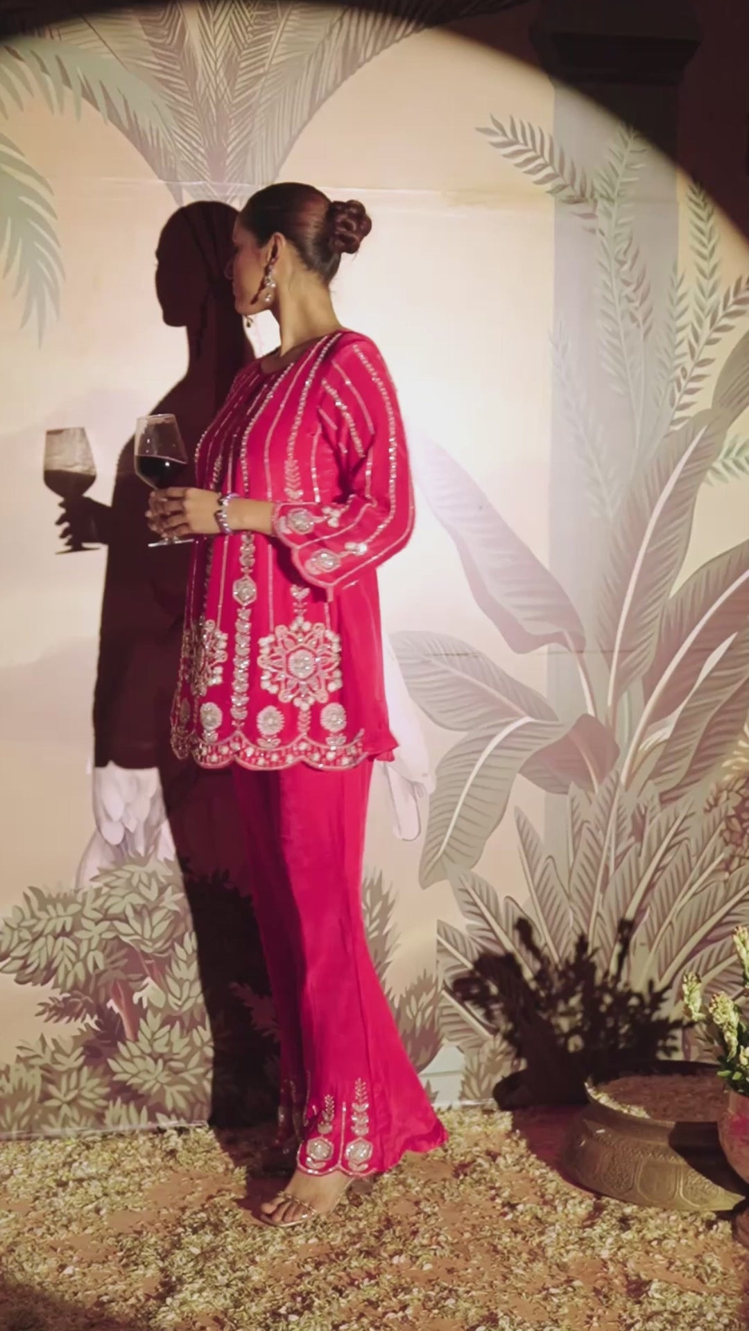 Hot Pink Embroidered Georgette Silk Jacket & Palazzo Set