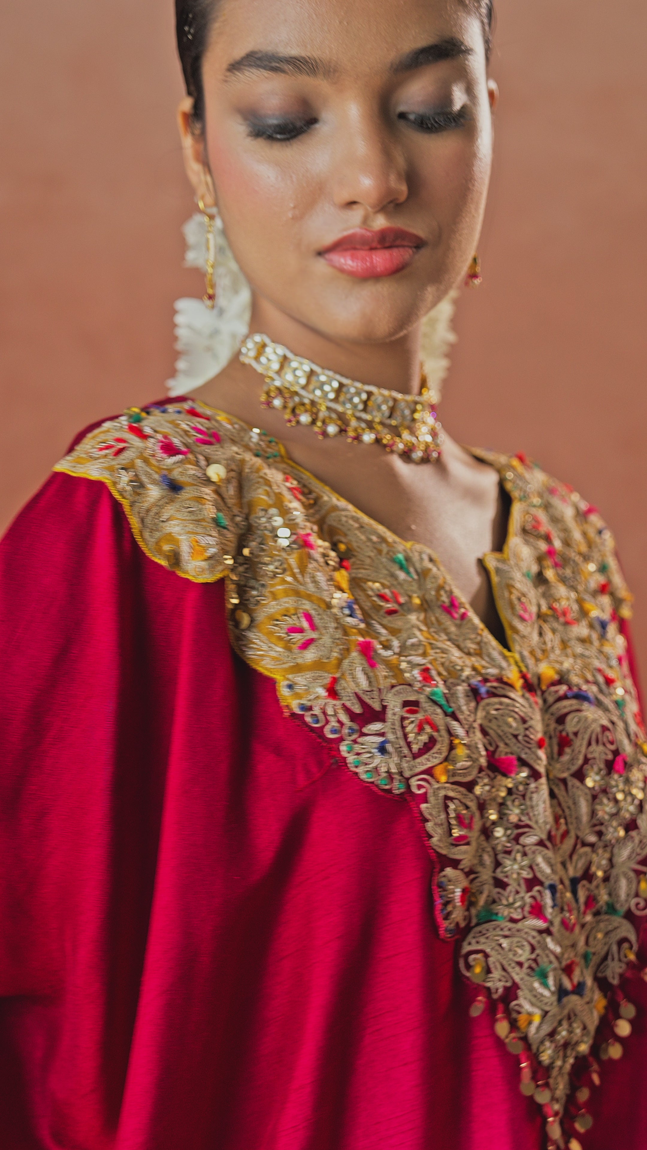 Rich Magenta Embellished Raw Silk Kaftan Set