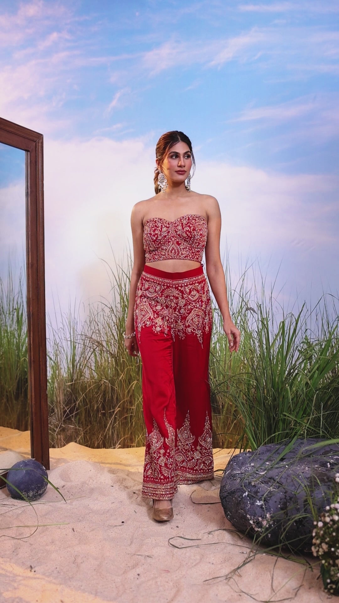 Pure Red Embellished Crushed Tissue Silk Pant Set
