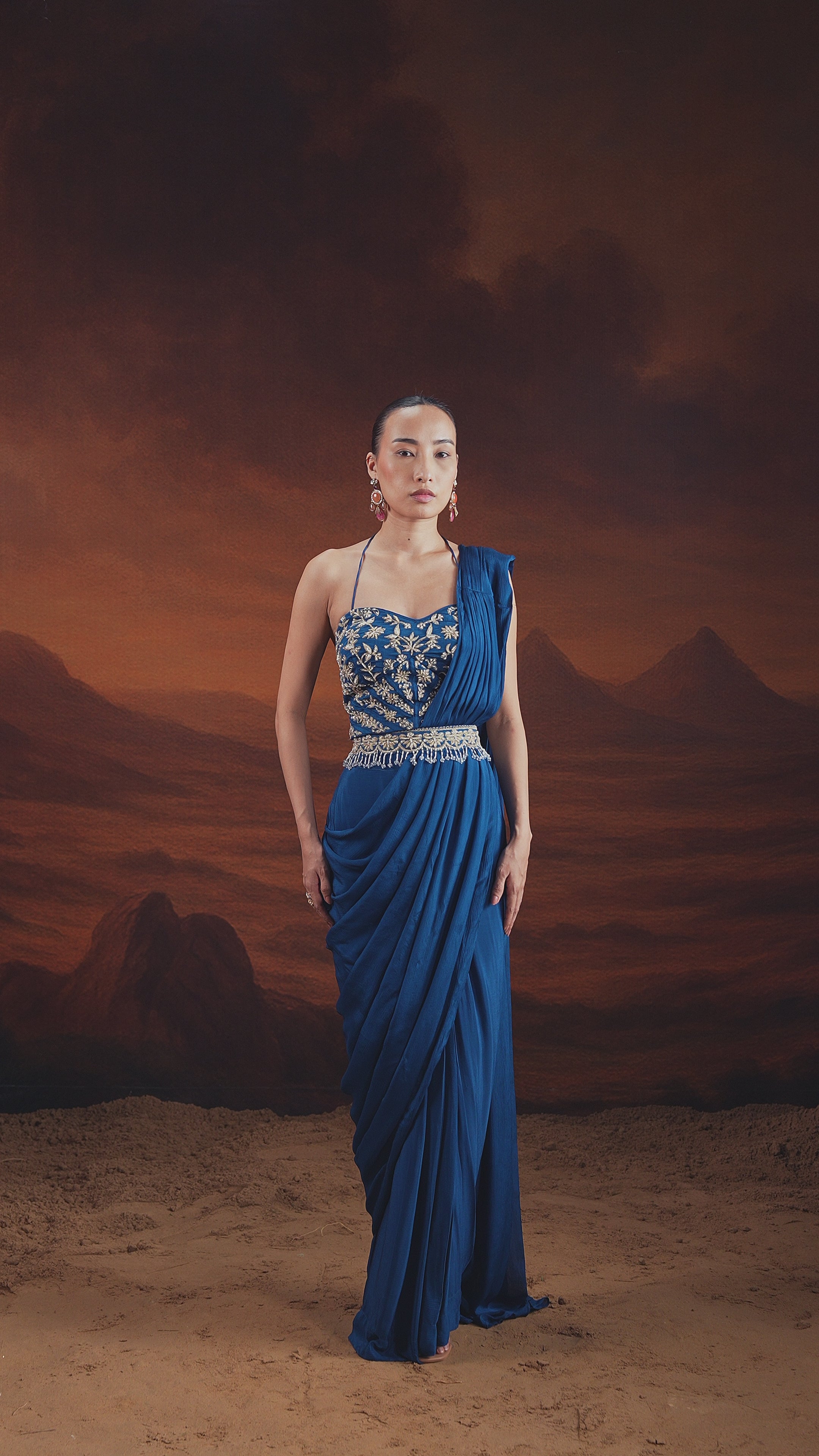 Teal Blue Embellished Crushed Tissue Silk Pant Set