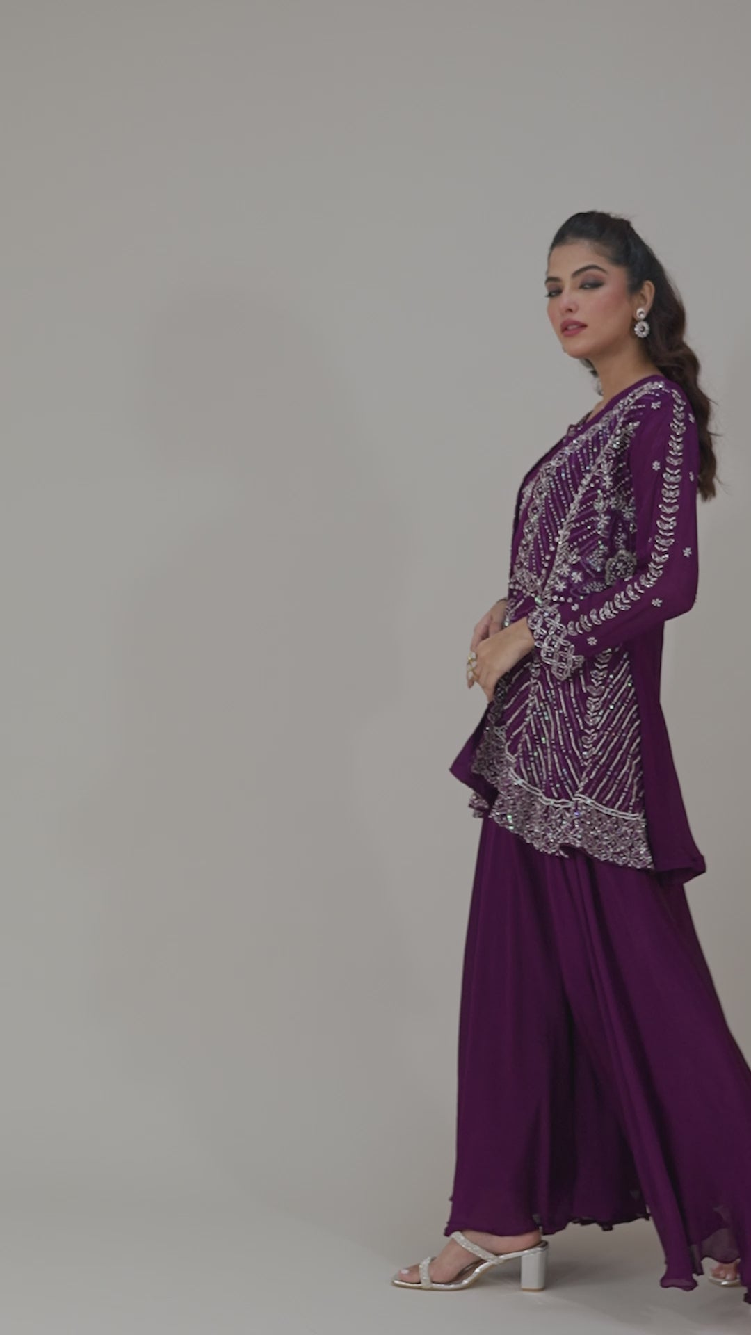 Royal Purple Embellished Chinon Silk Jacket & Palazzo Set