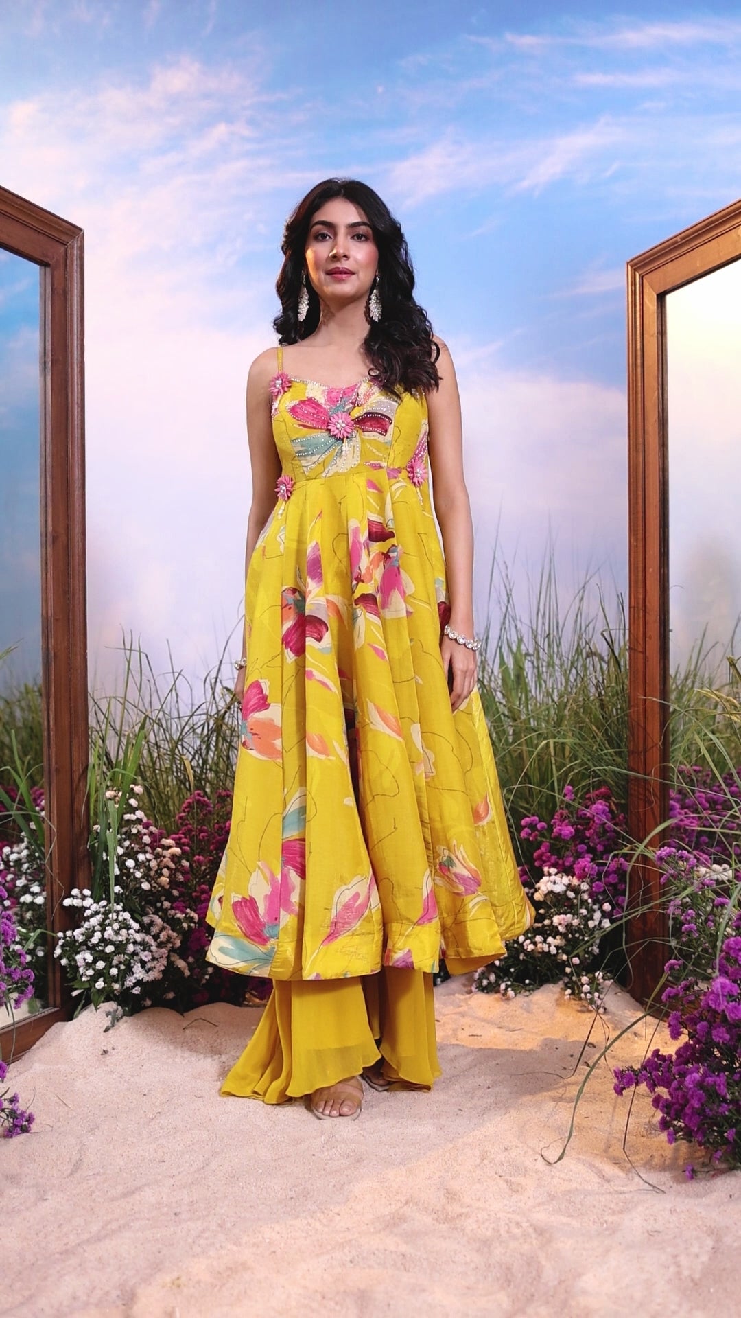 Spring Yellow Floral Printed Premium Silk Anarkali Set
