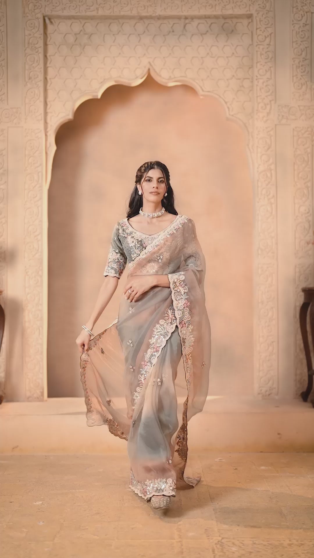 Shaded Grey Embellished Organza Satin Saree