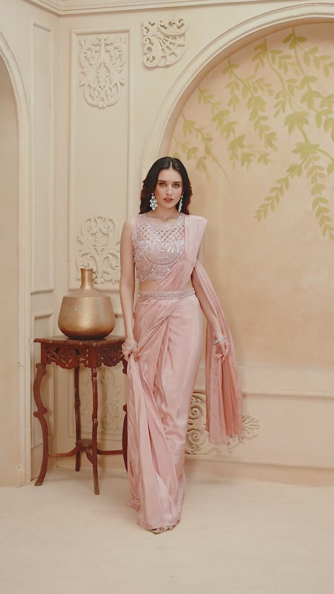 Blush Pink Embellished Satin Silk Draped Saree