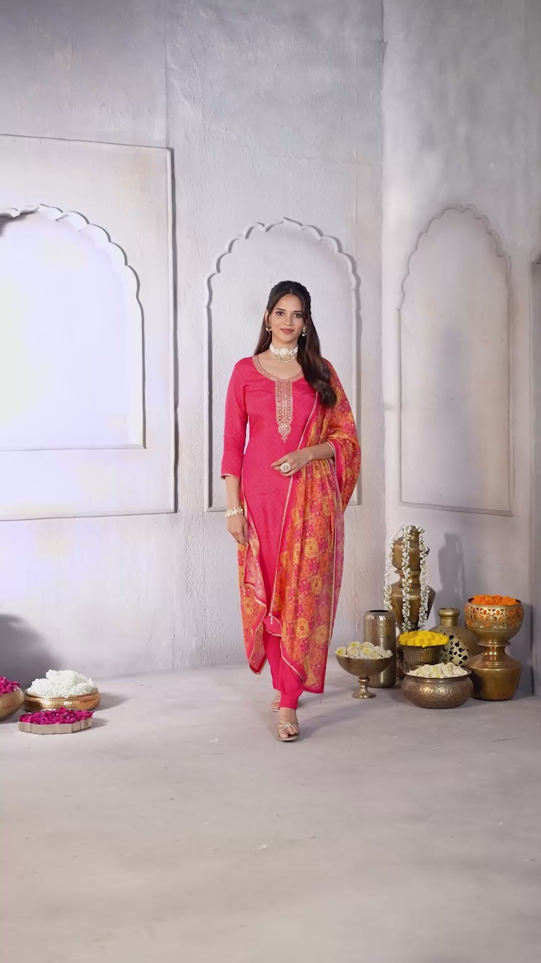 Vibrant Pink Embellished Chinon Silk Sharara Set