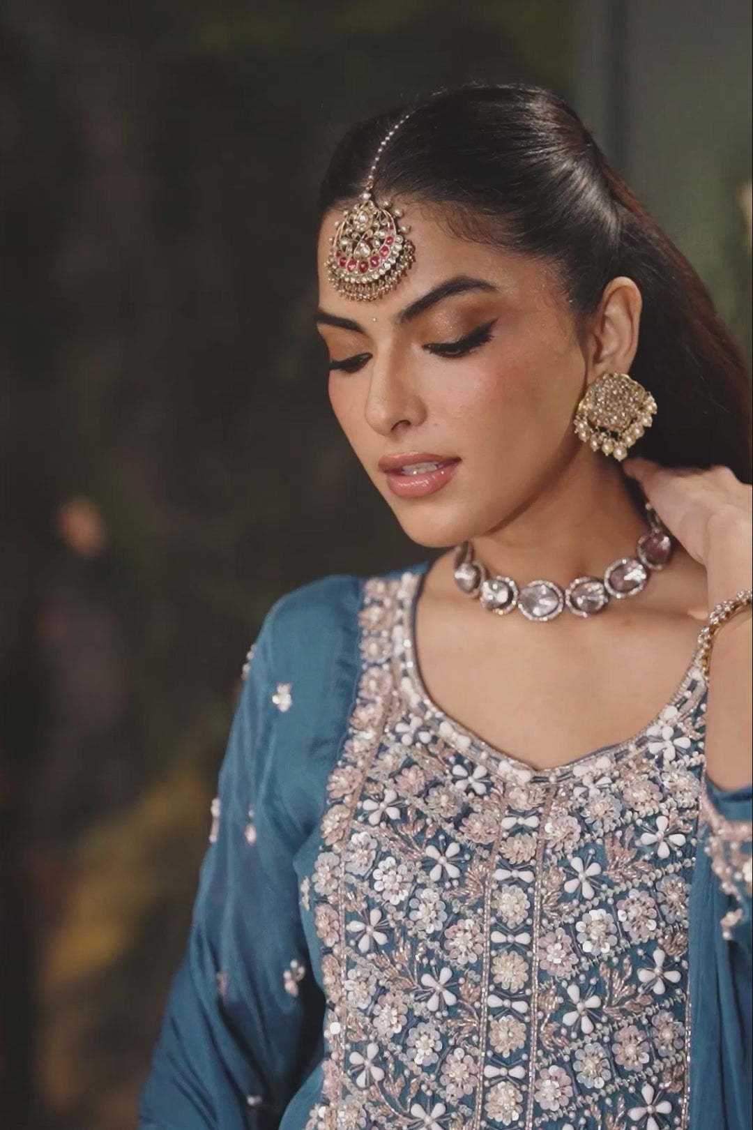Teal Blue Embellished Chinon Silk Palazzo Set