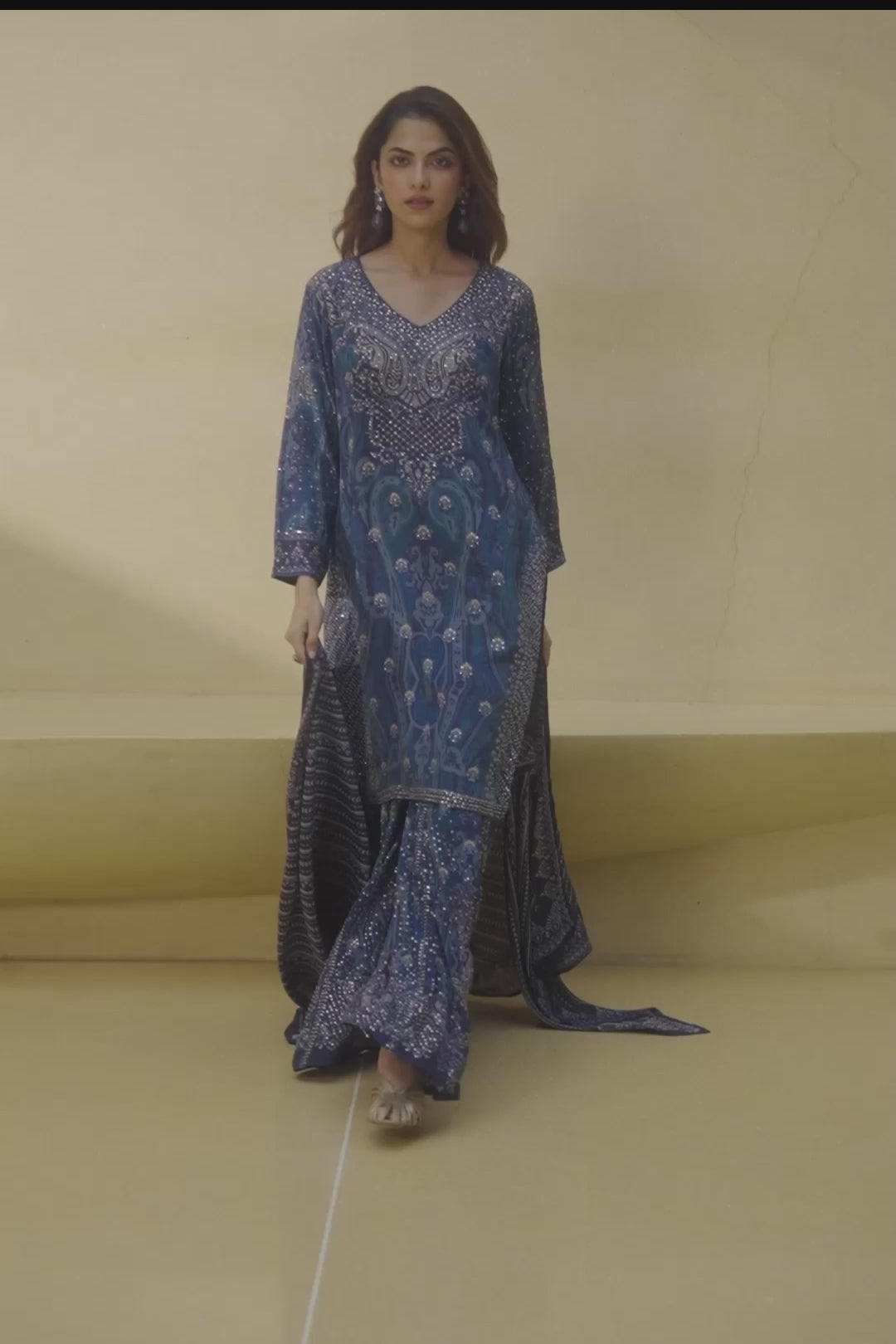 Midnight Blue Embellished Chinon Silk Kaftan Set