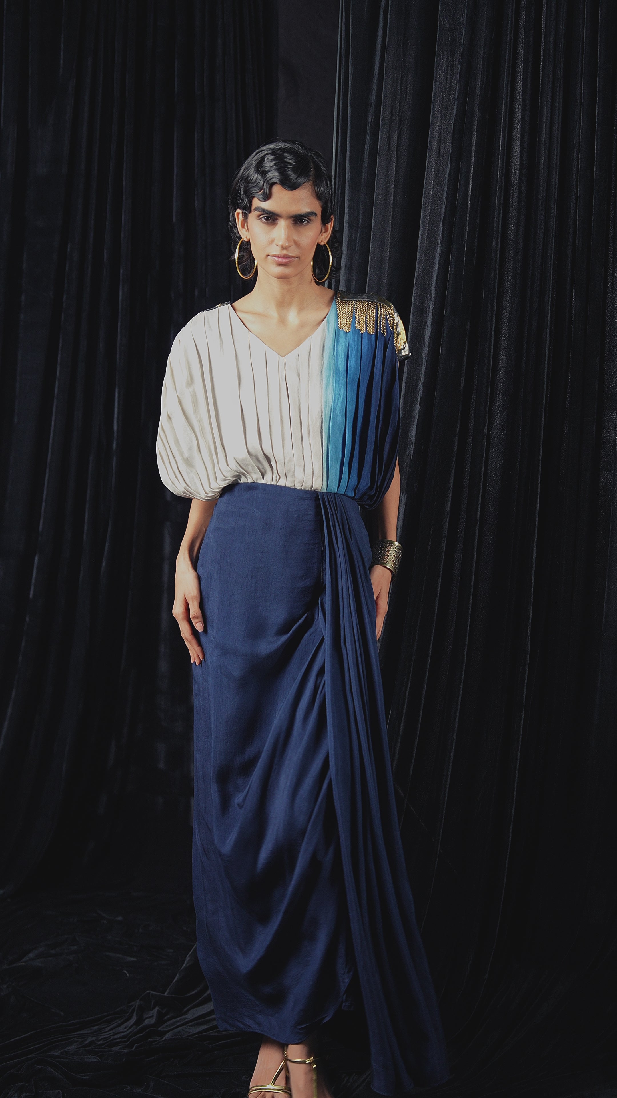 Indigo Blue Embellished Satin Silk Drape Saree