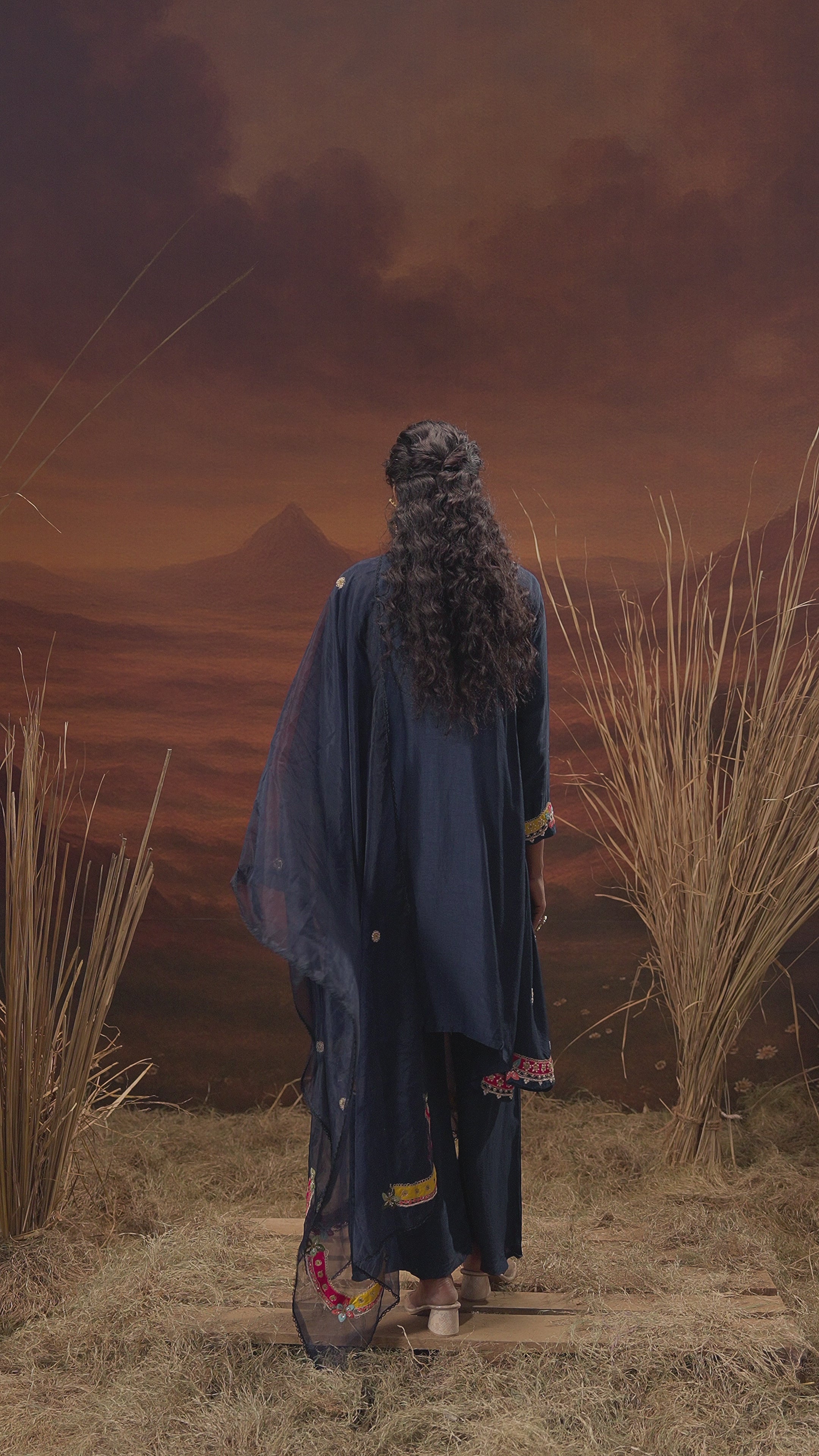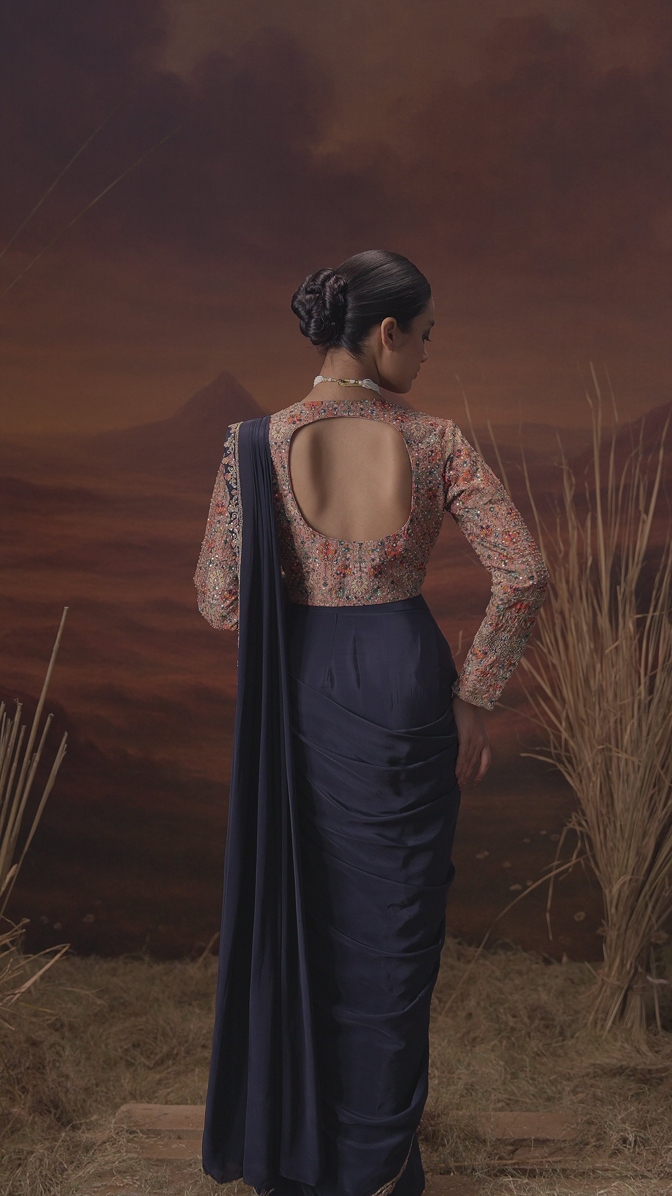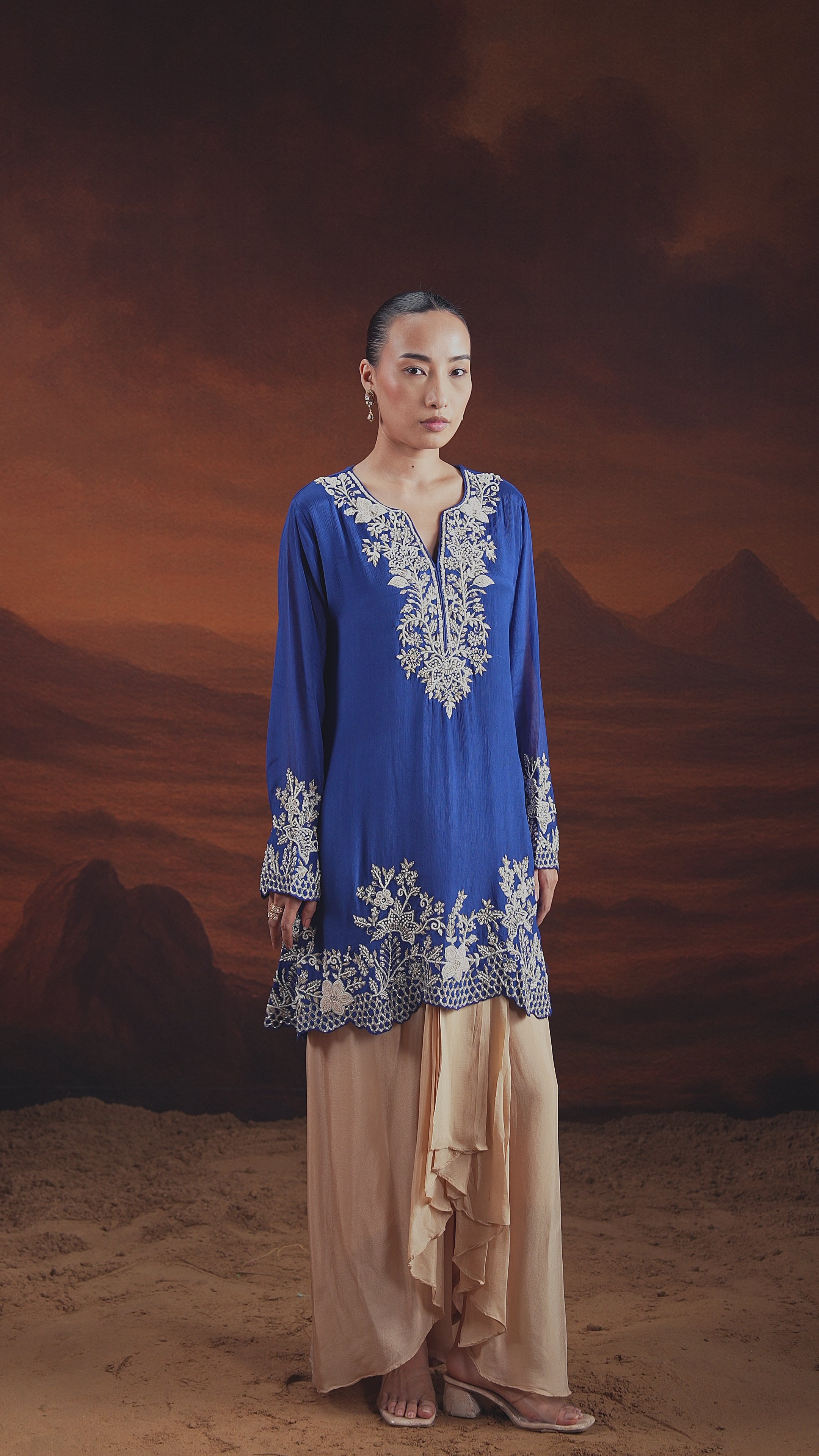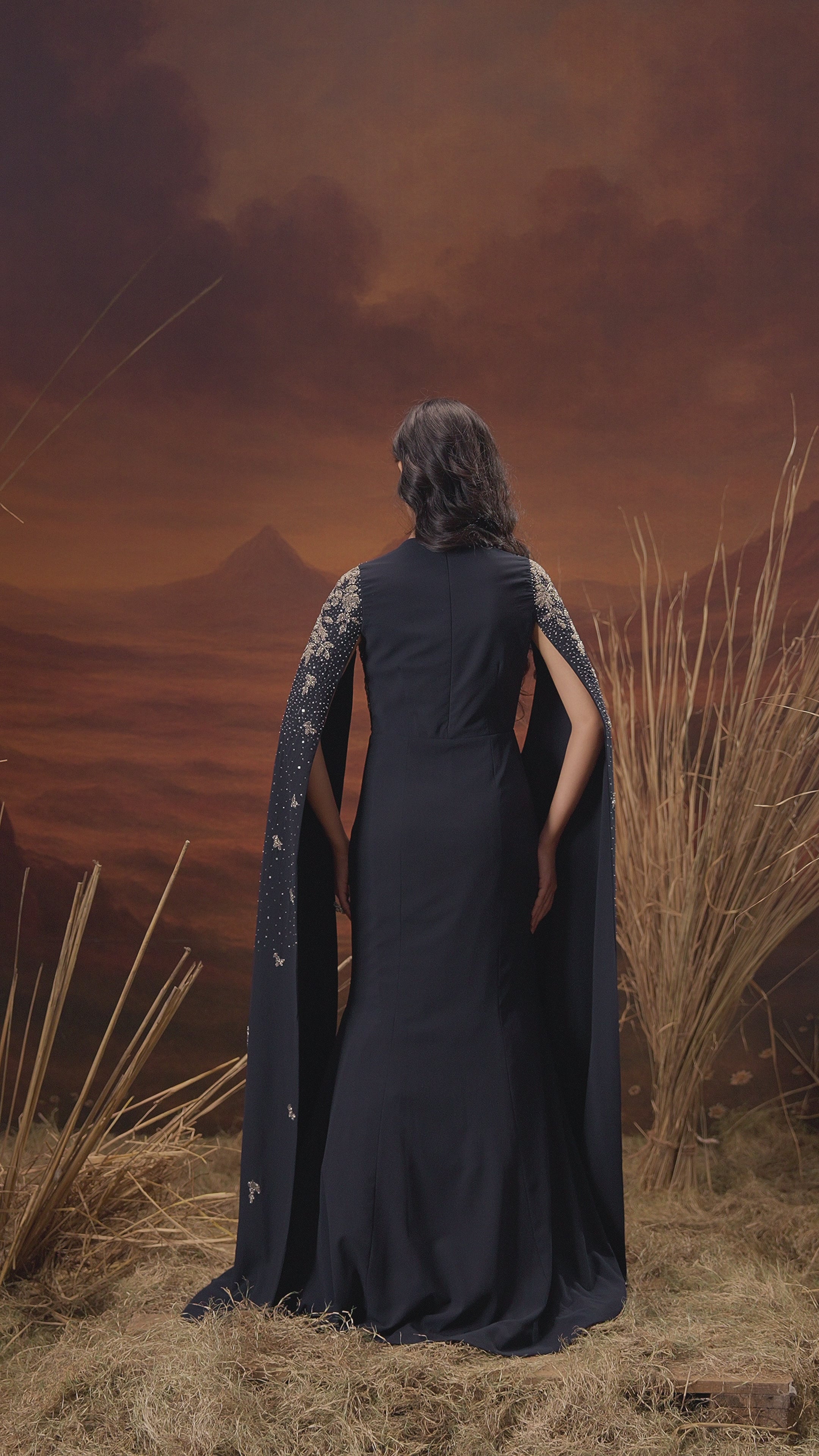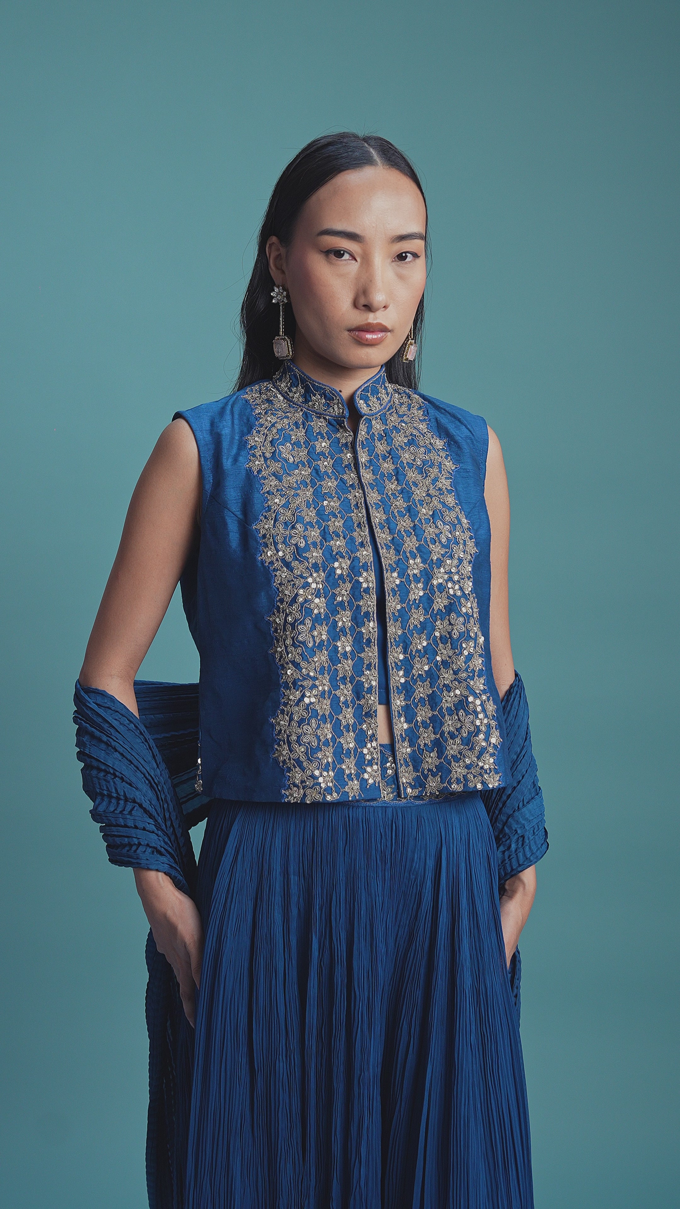Deep Blue Embellished Satin Silk Cape Skirt Set