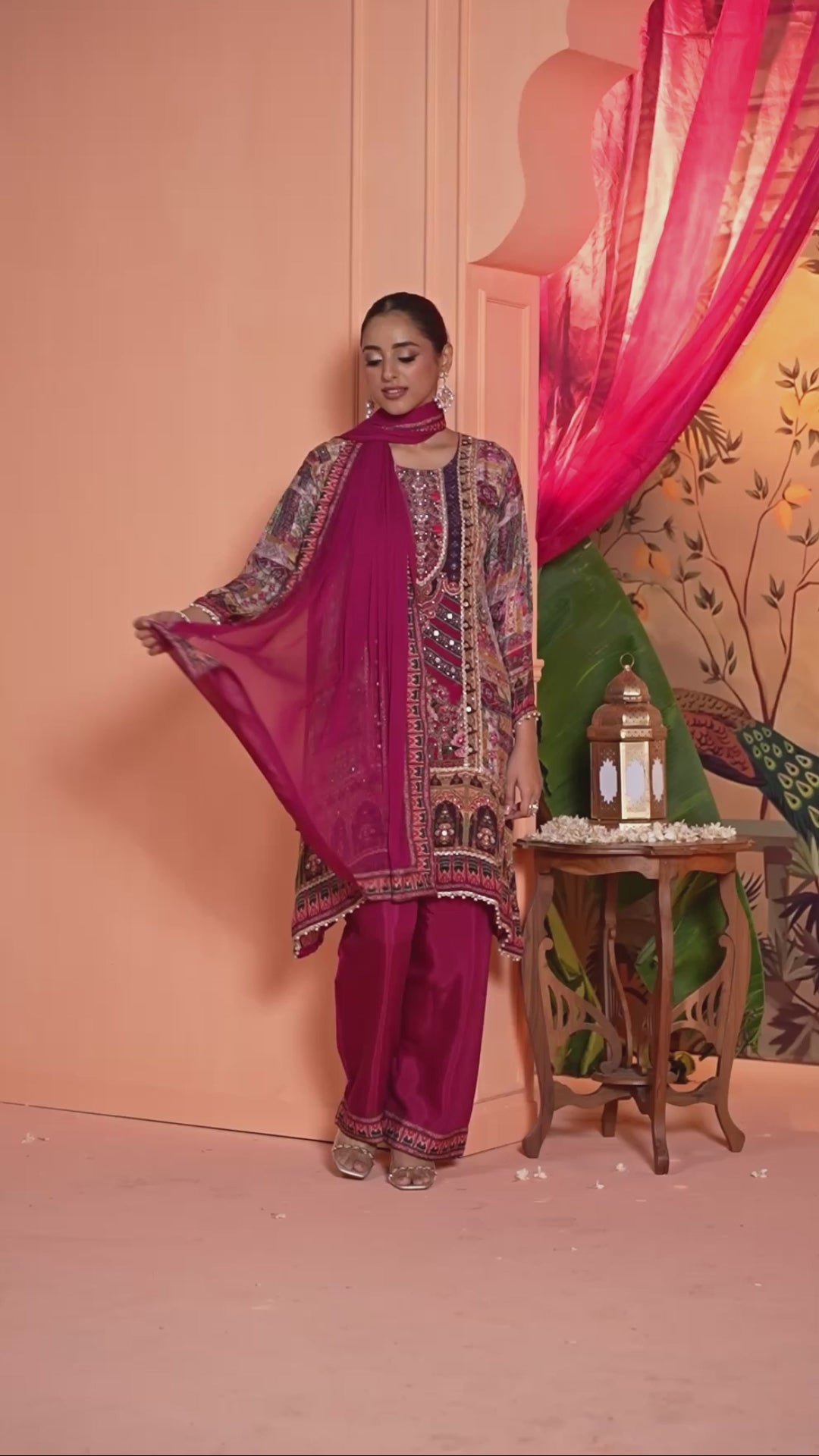 Magenta Pink Embellished Premium Silk Palazzo Set