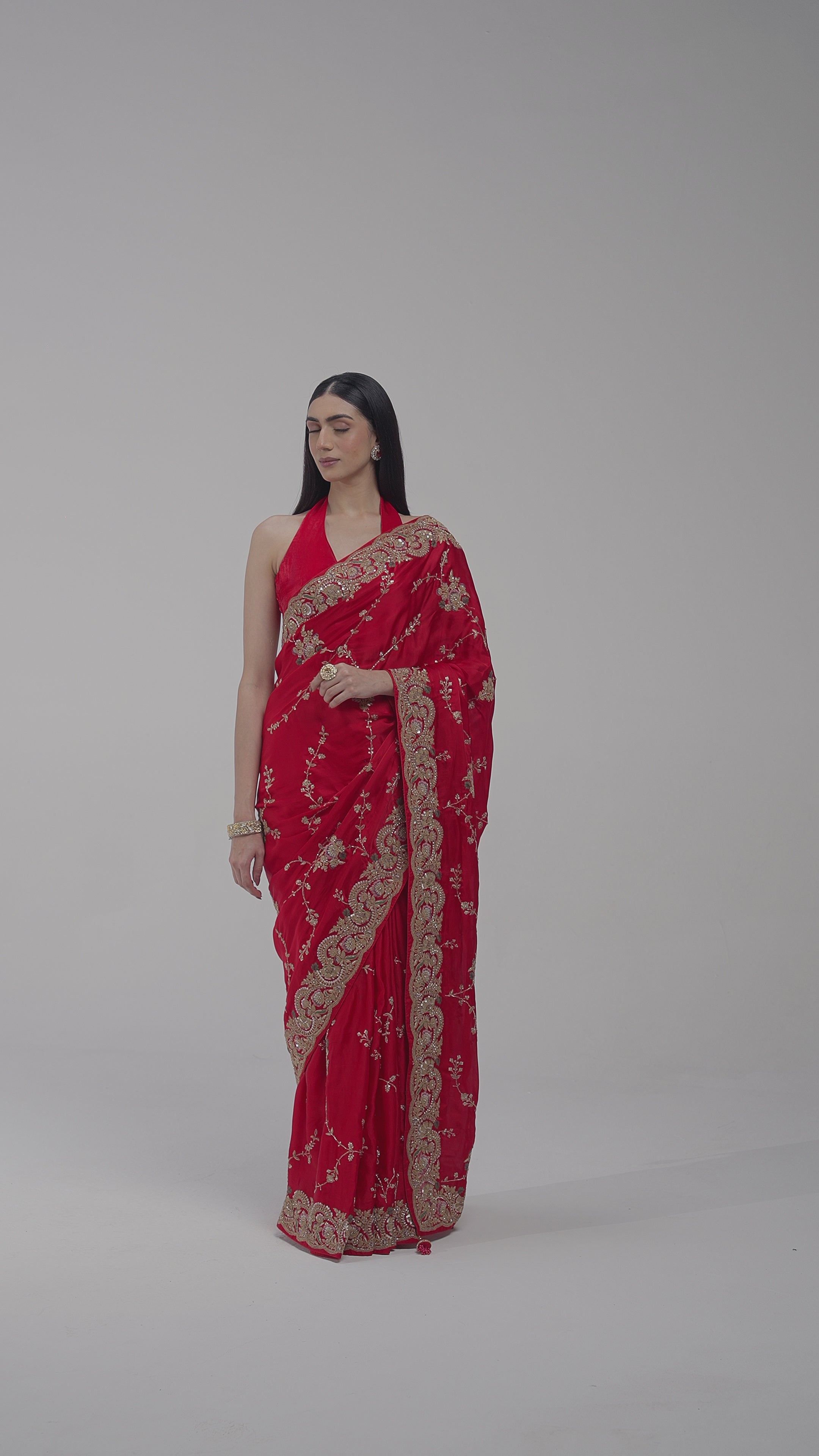 Ruby Red Embellished Satin Silk Drape Saree