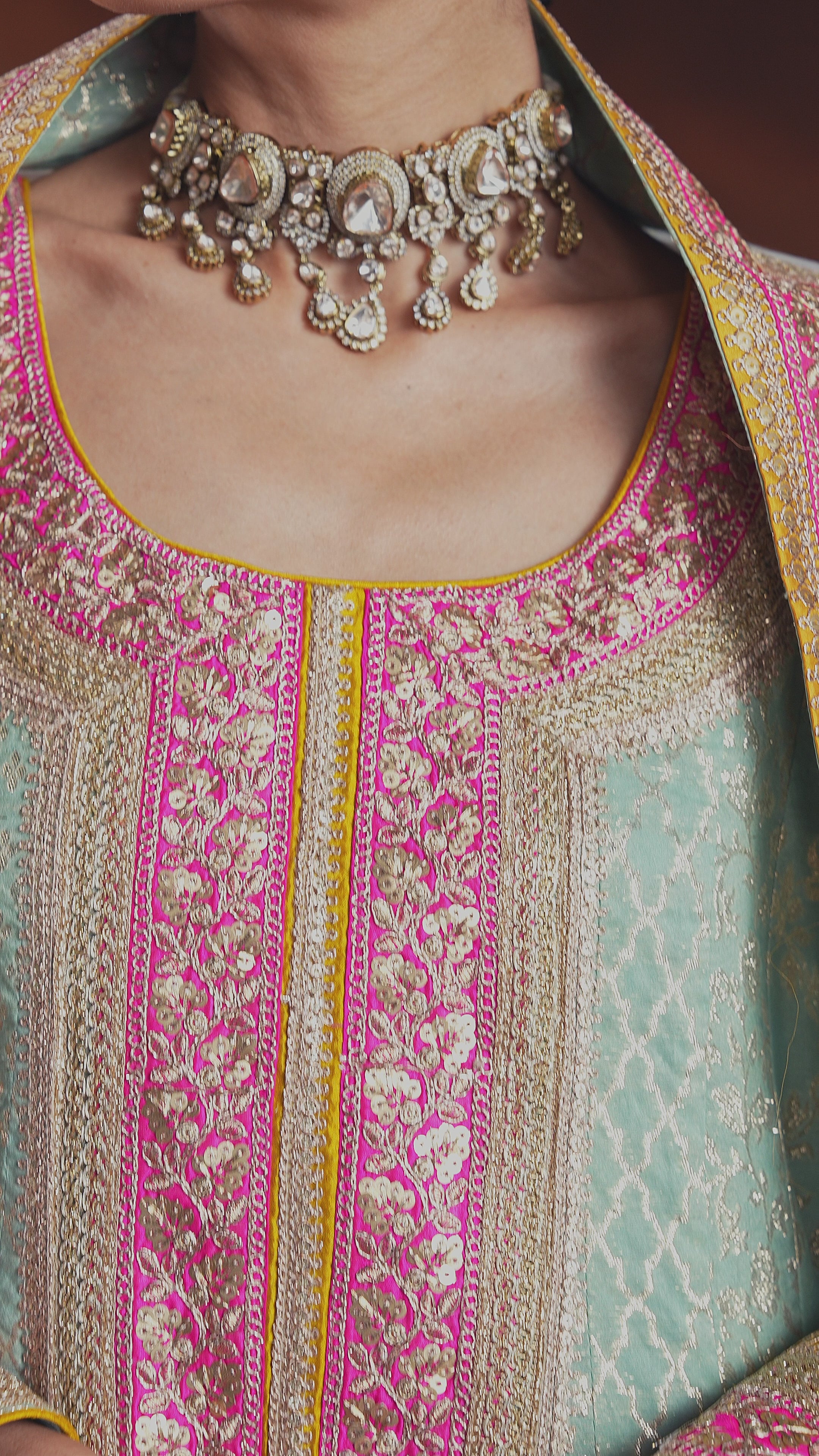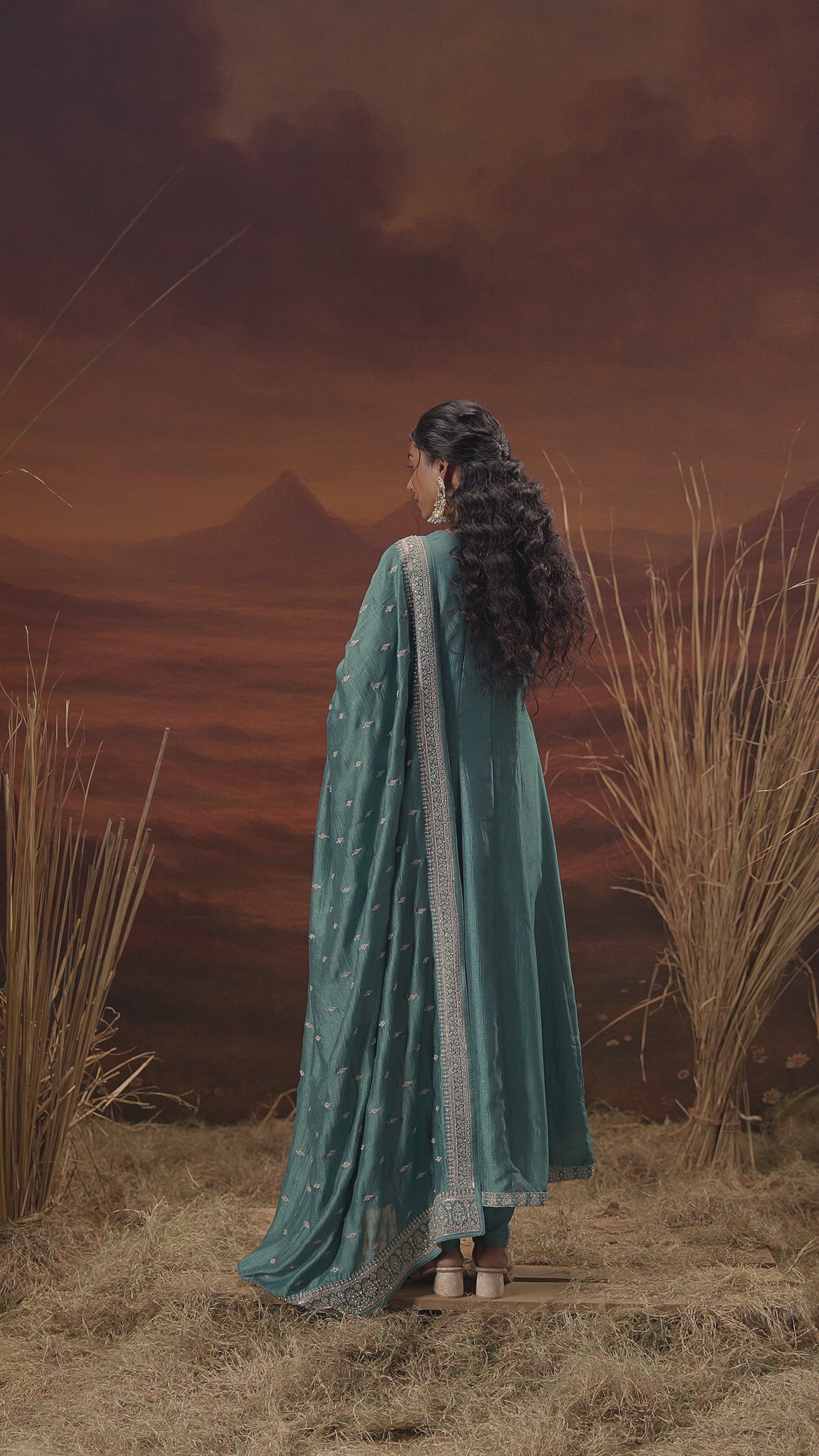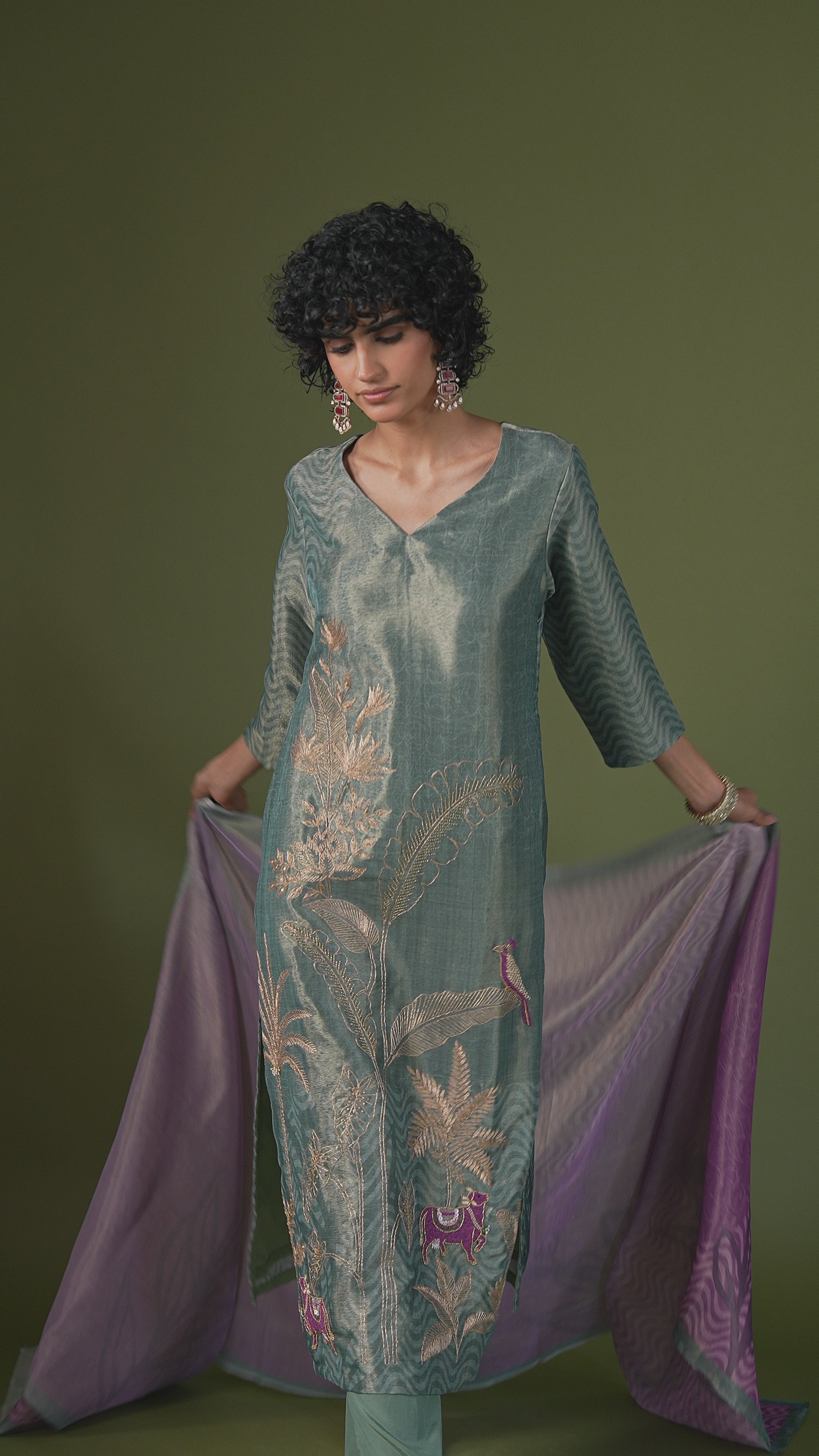 Grayish-Green Embellished Chanderi Silk Pant Set