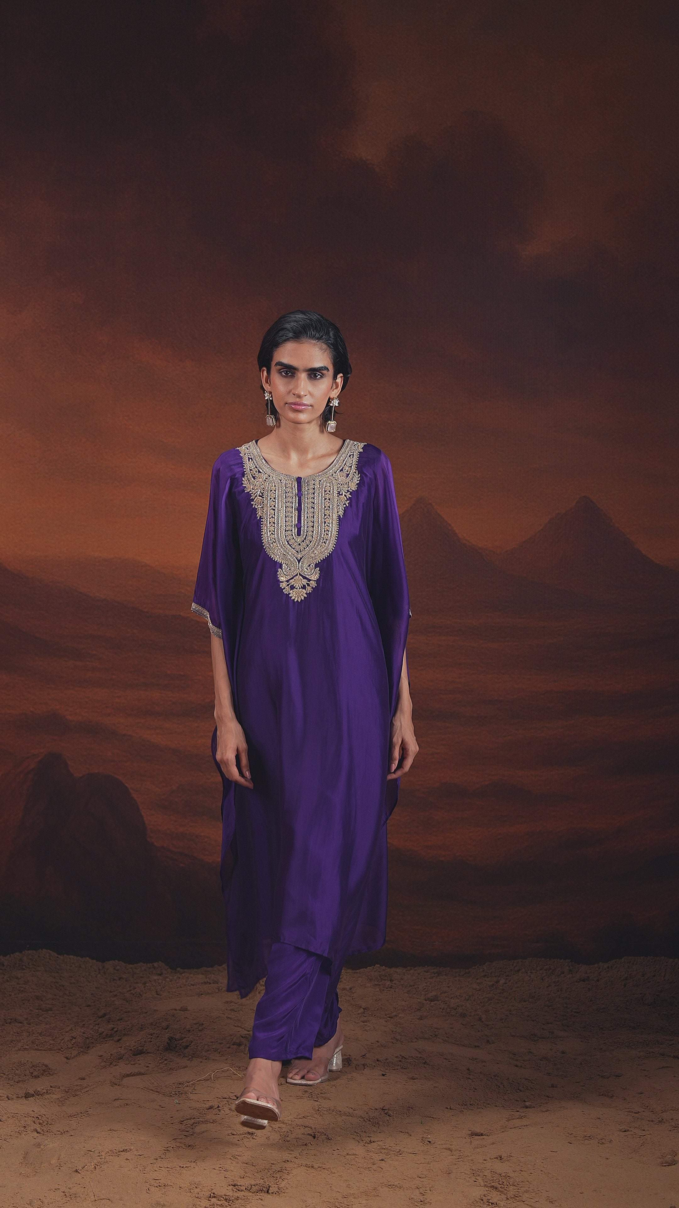 Deep Purple Embellished Chinon Silk Kaftan Set