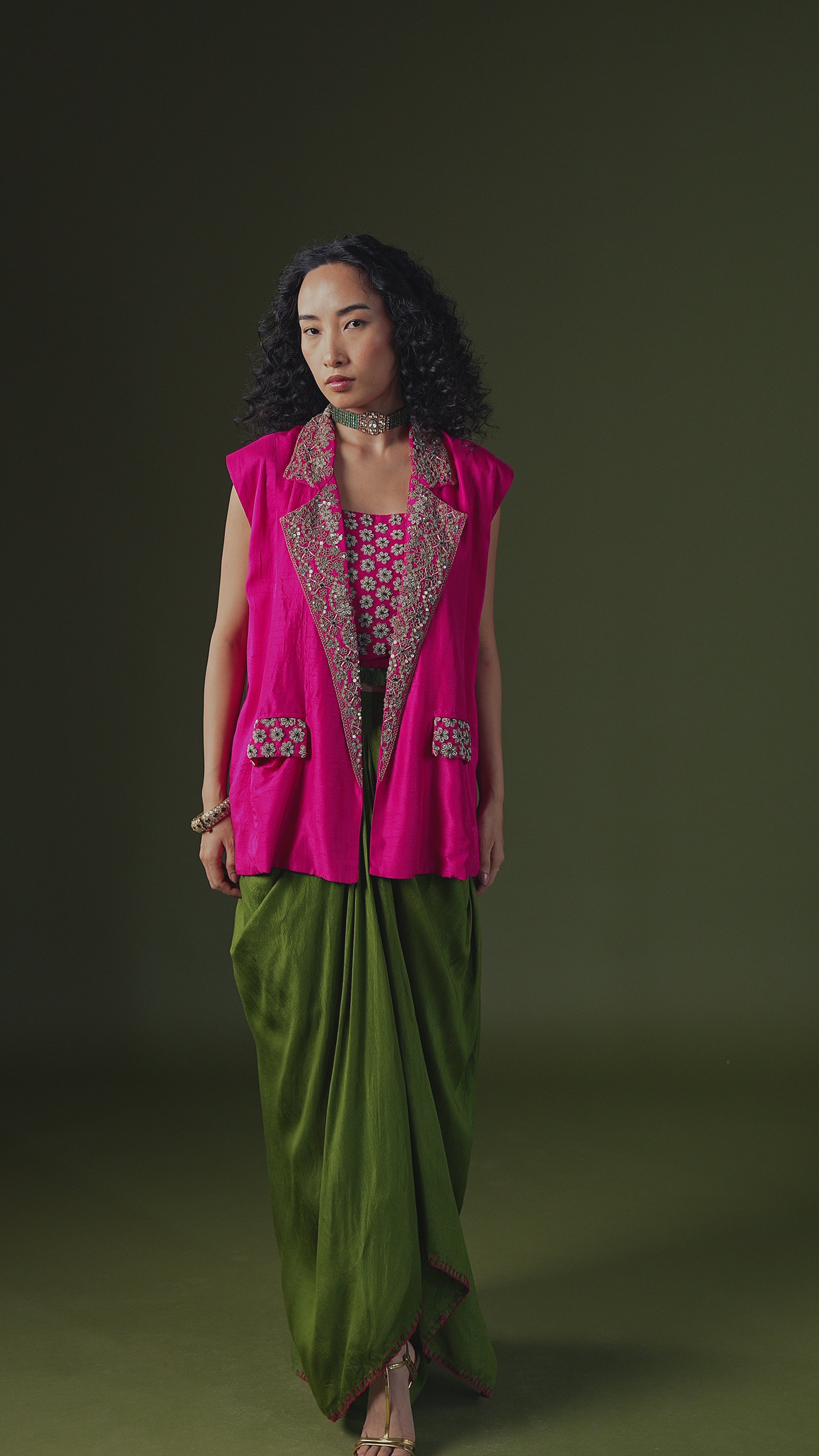 Bold Pink Embellished Raw Silk Drape Skirt With Jacket