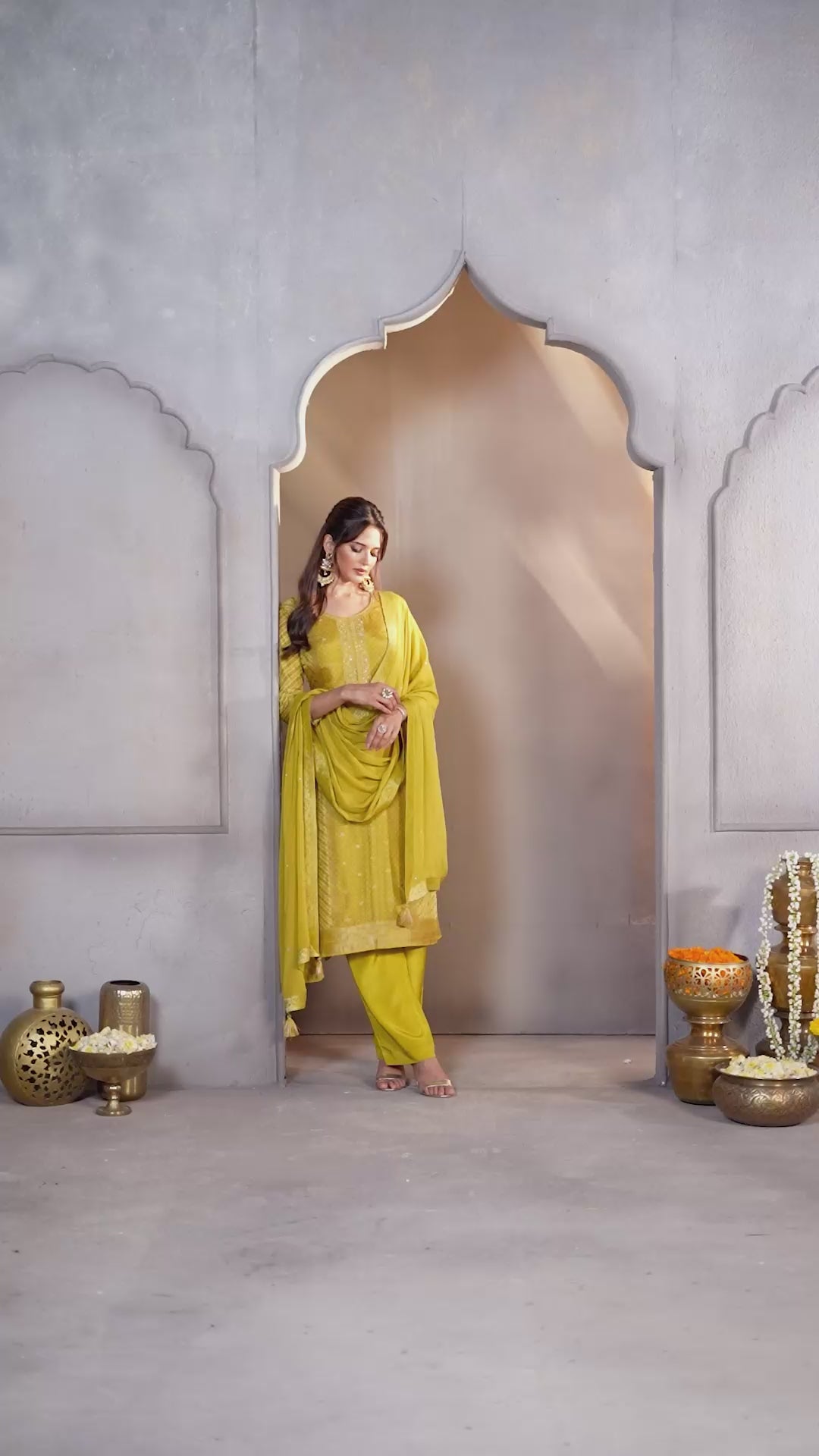 Mustard Yellow Printed Jacquard Silk Pant Set