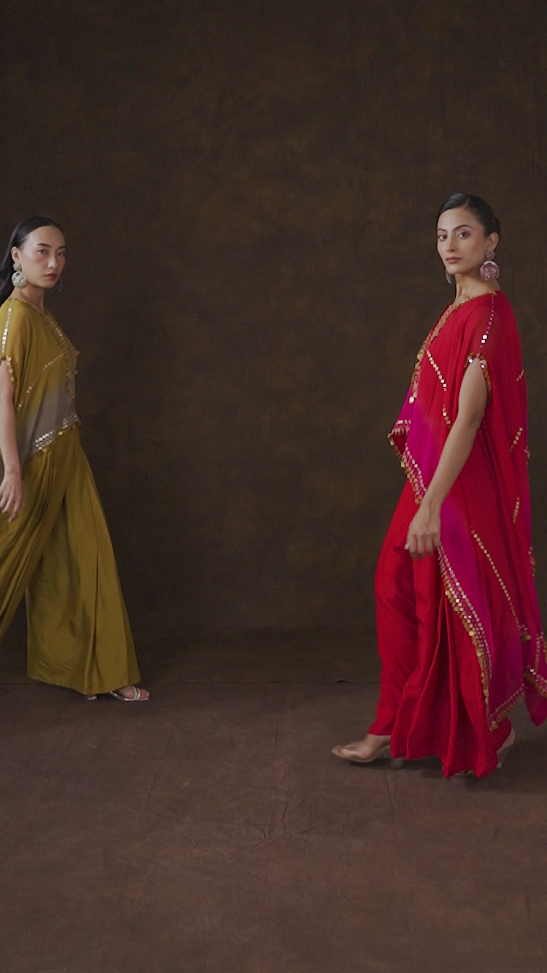 Rose Red Ombre Embellished Raw Silk Cape Set