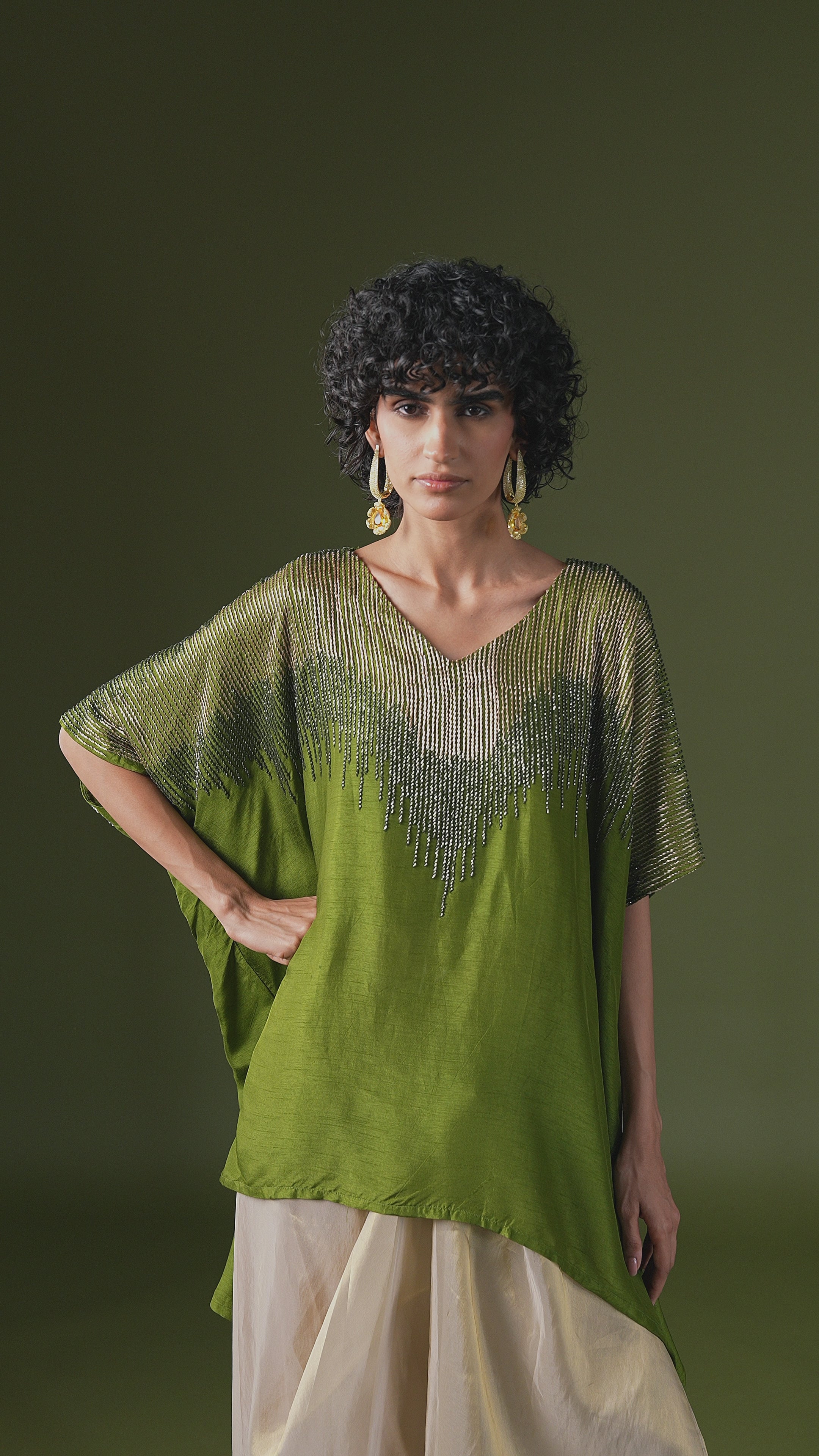 Lime Green Embroidered Georgette Silk Kaftan Set