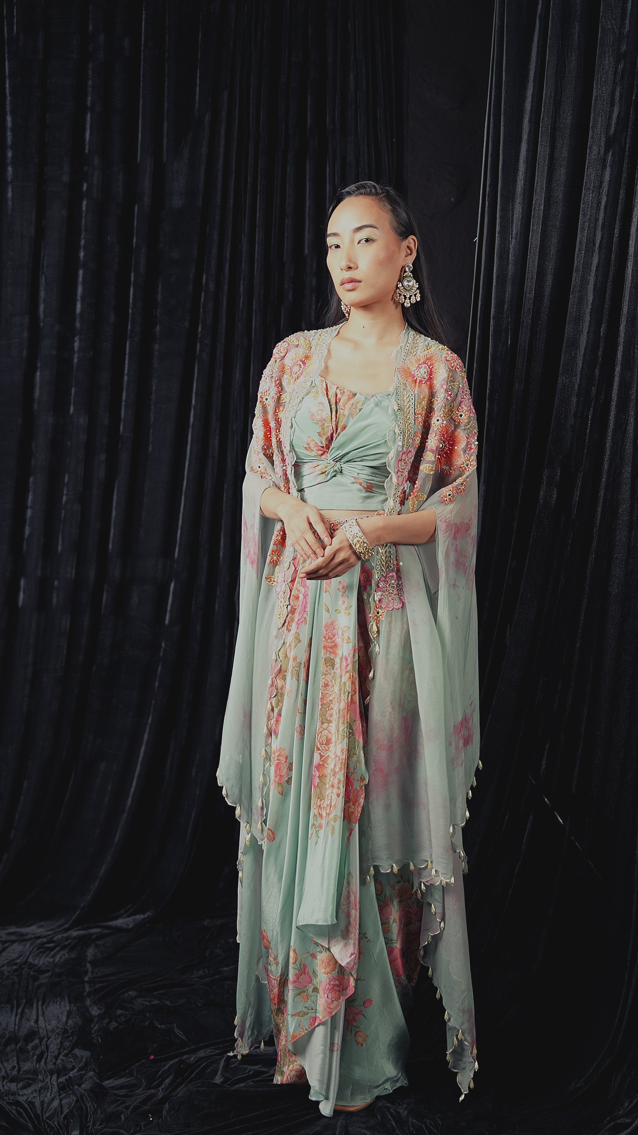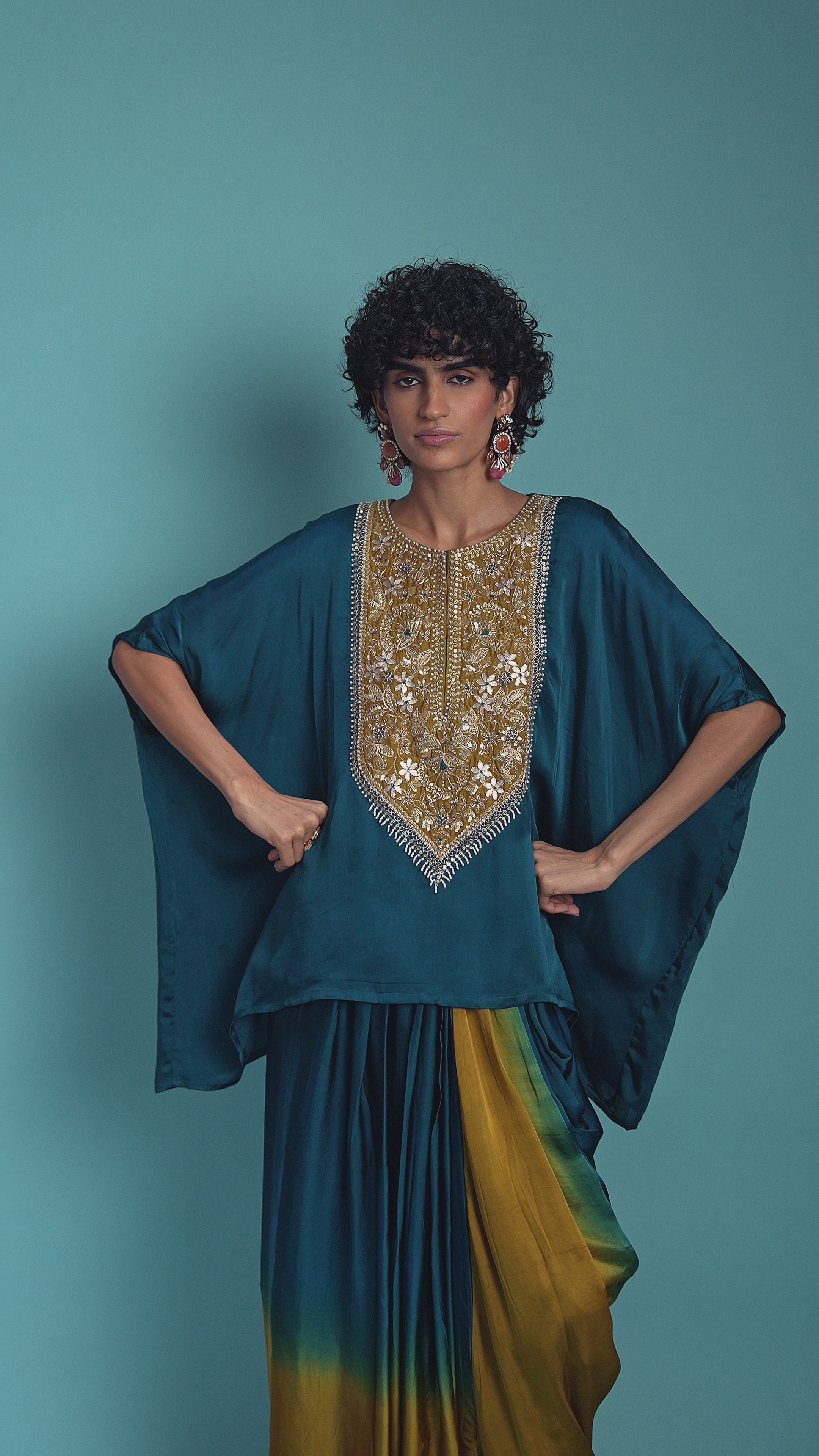 Teal Green Embellished Satin Silk Drape Skirt Set