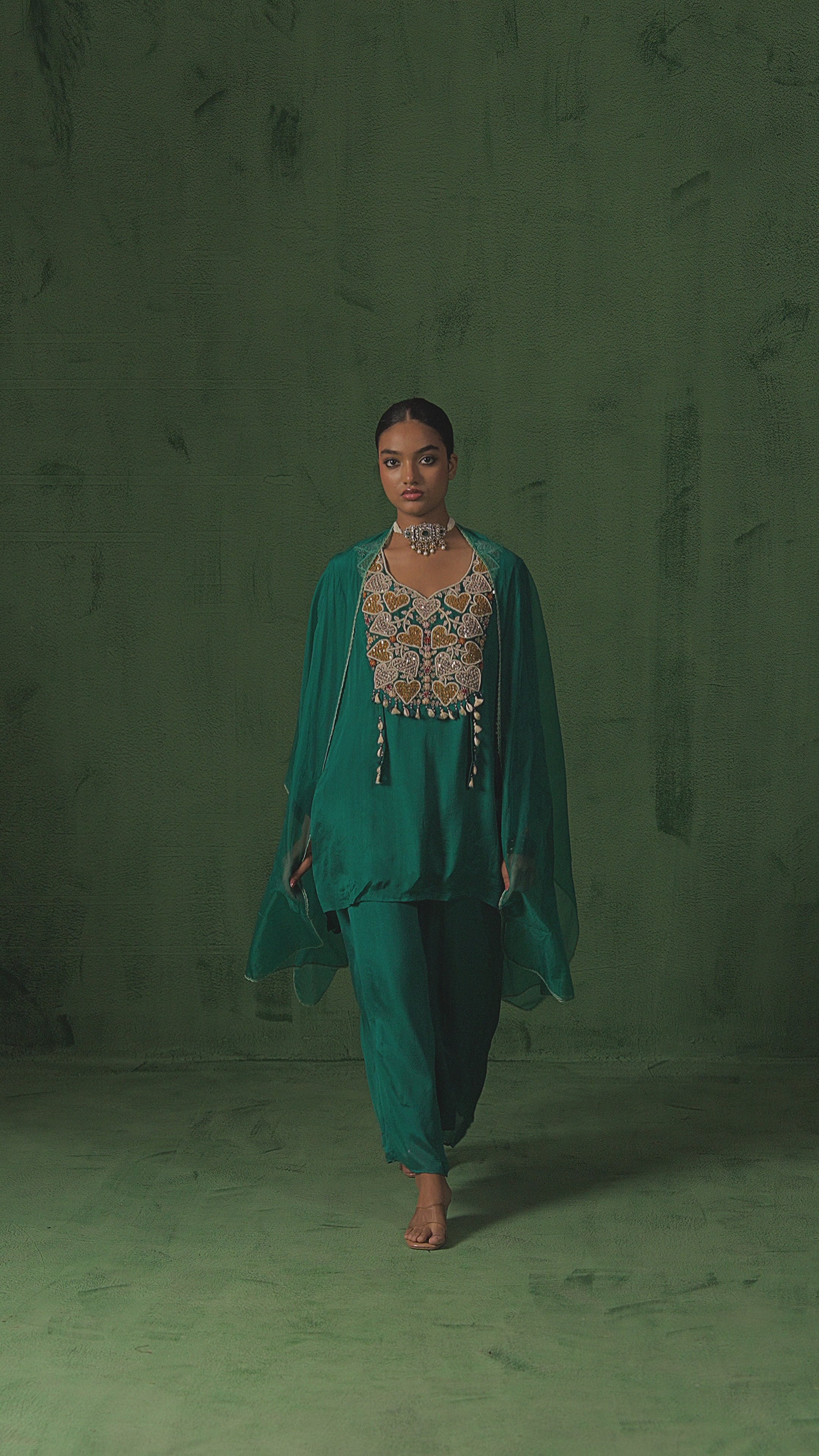 Bottle Green embellished Raw Silk Cape Set