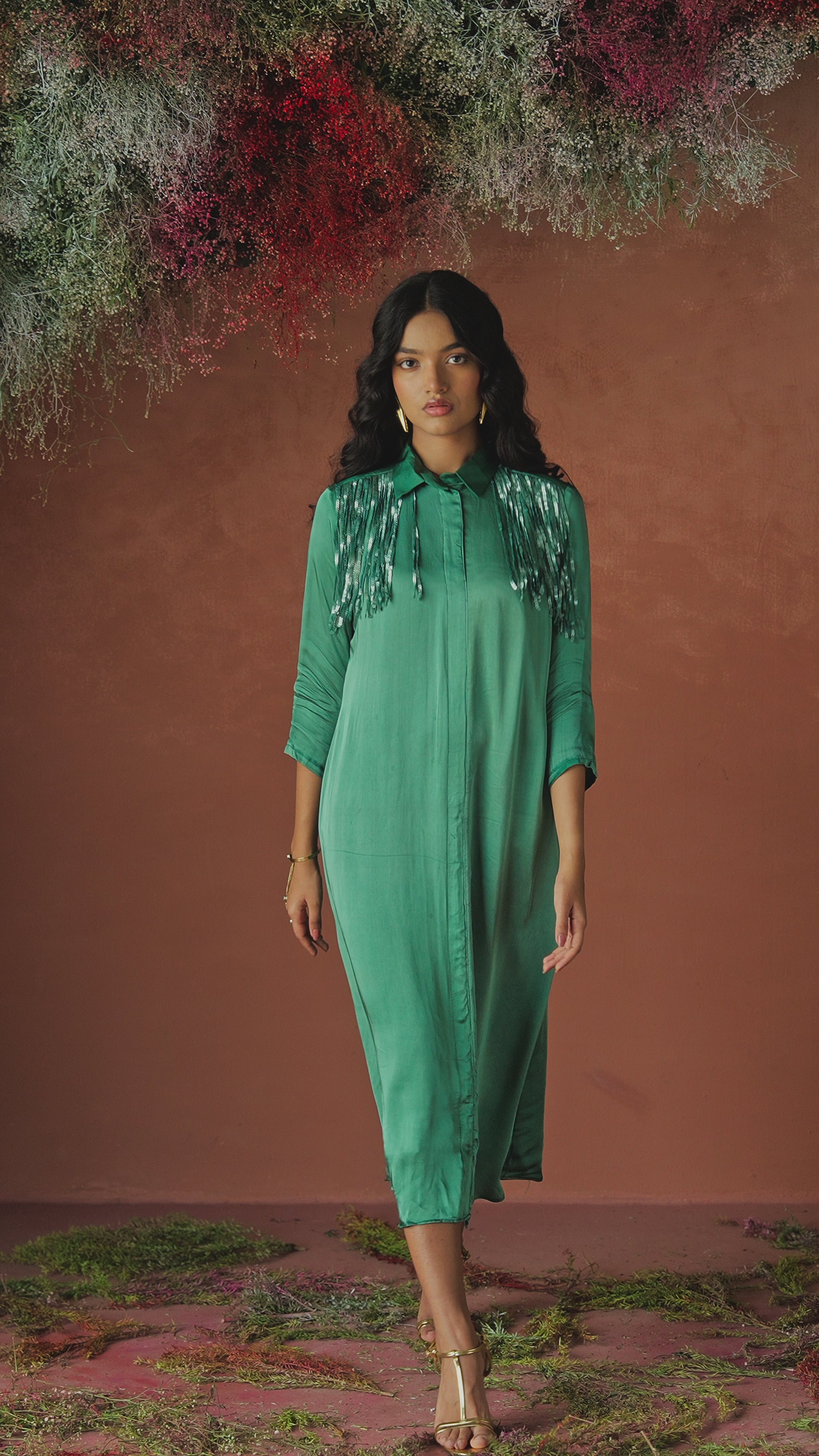 Emerald Green Embellished Satin Silk Skirt Set