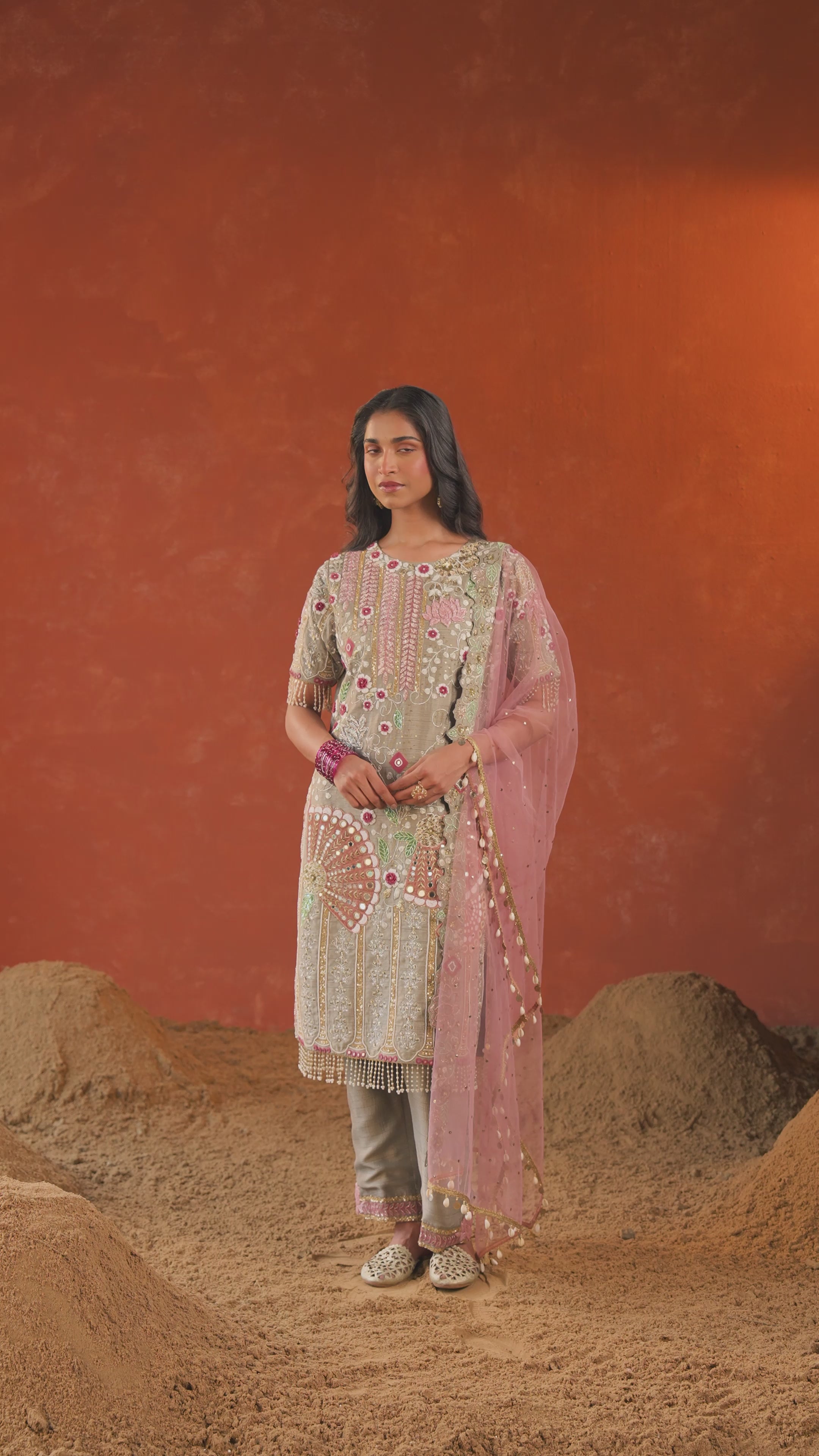 Light Grey Embellished Raw Silk Pant Set
