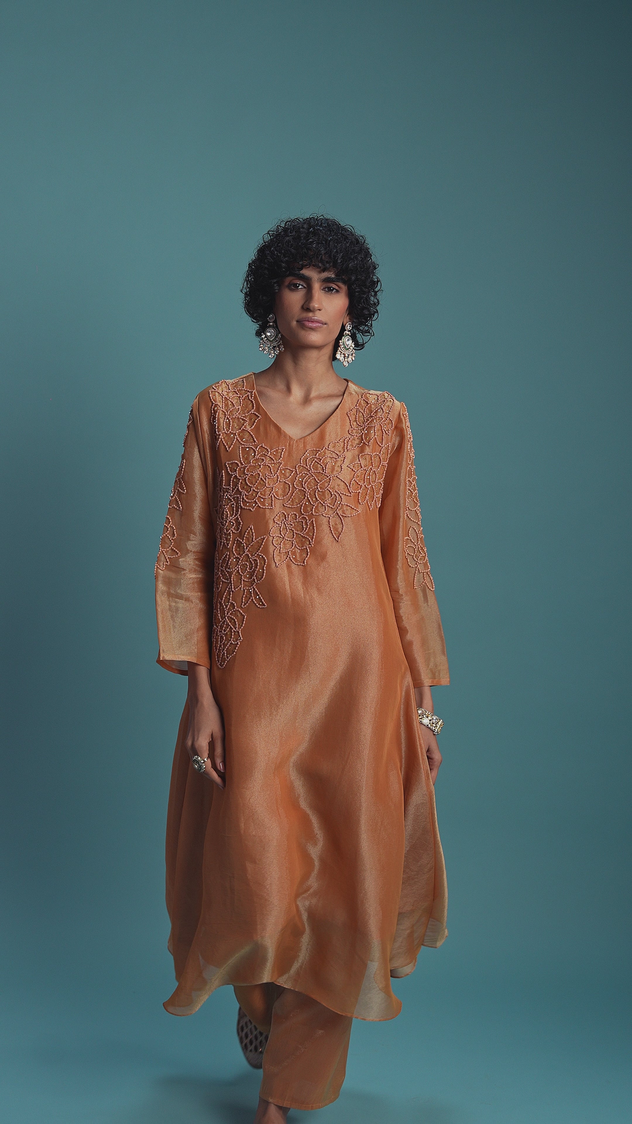 Rust Gold Embellished Shimmer Tissue Silk Kurta Set