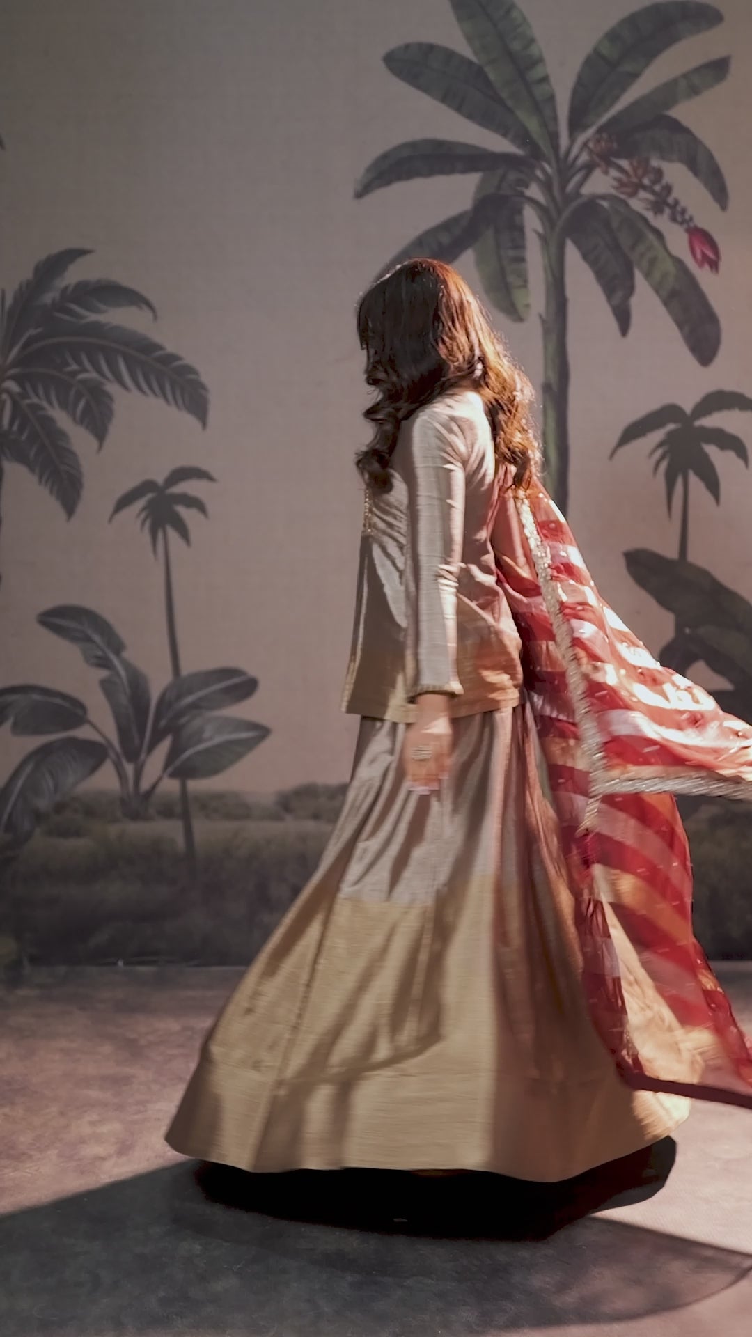 Beige Gold Mirror Embellished Raw Silk Lehenga Set