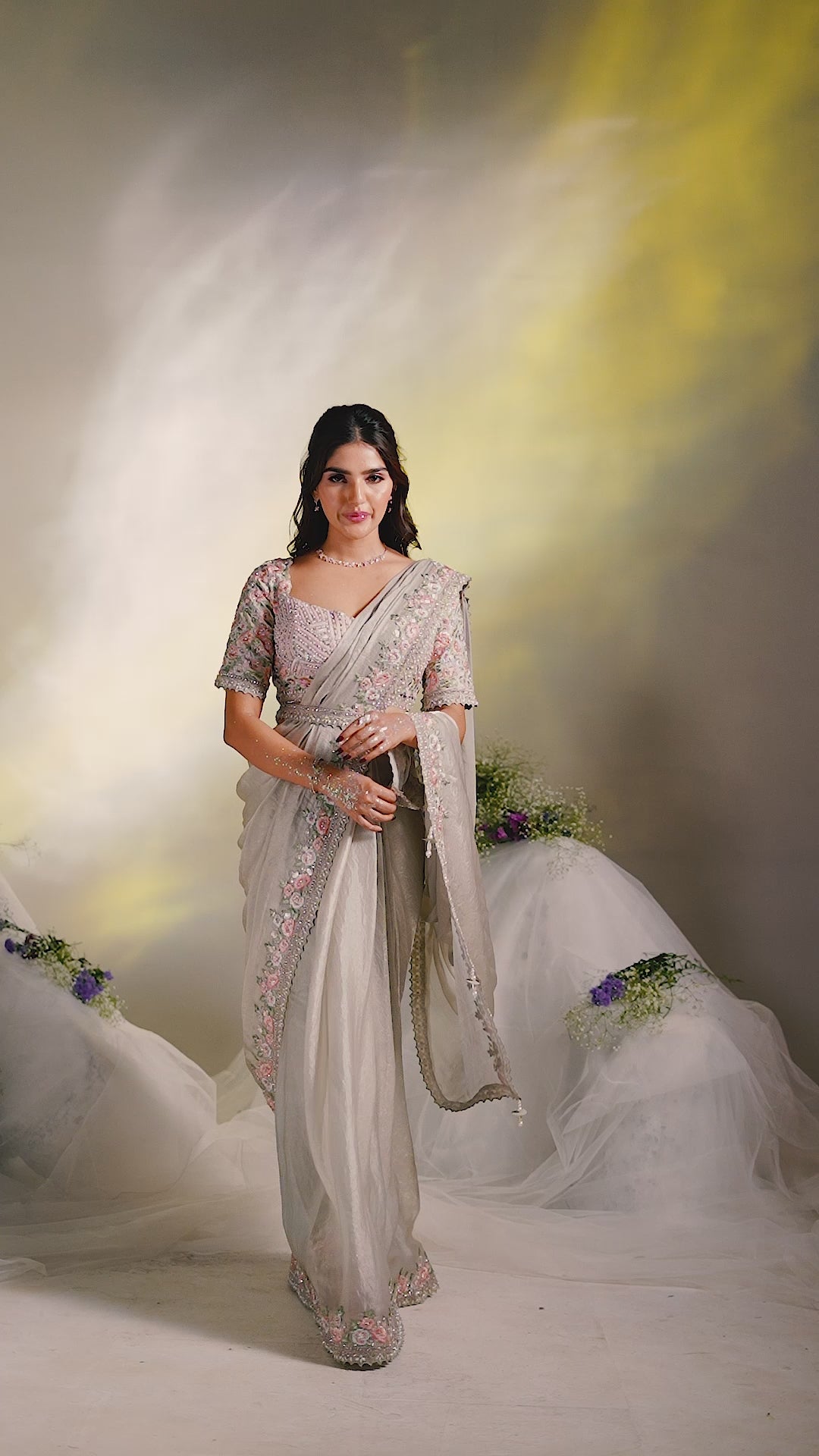 White Smoke Embellished Satin Silk Saree