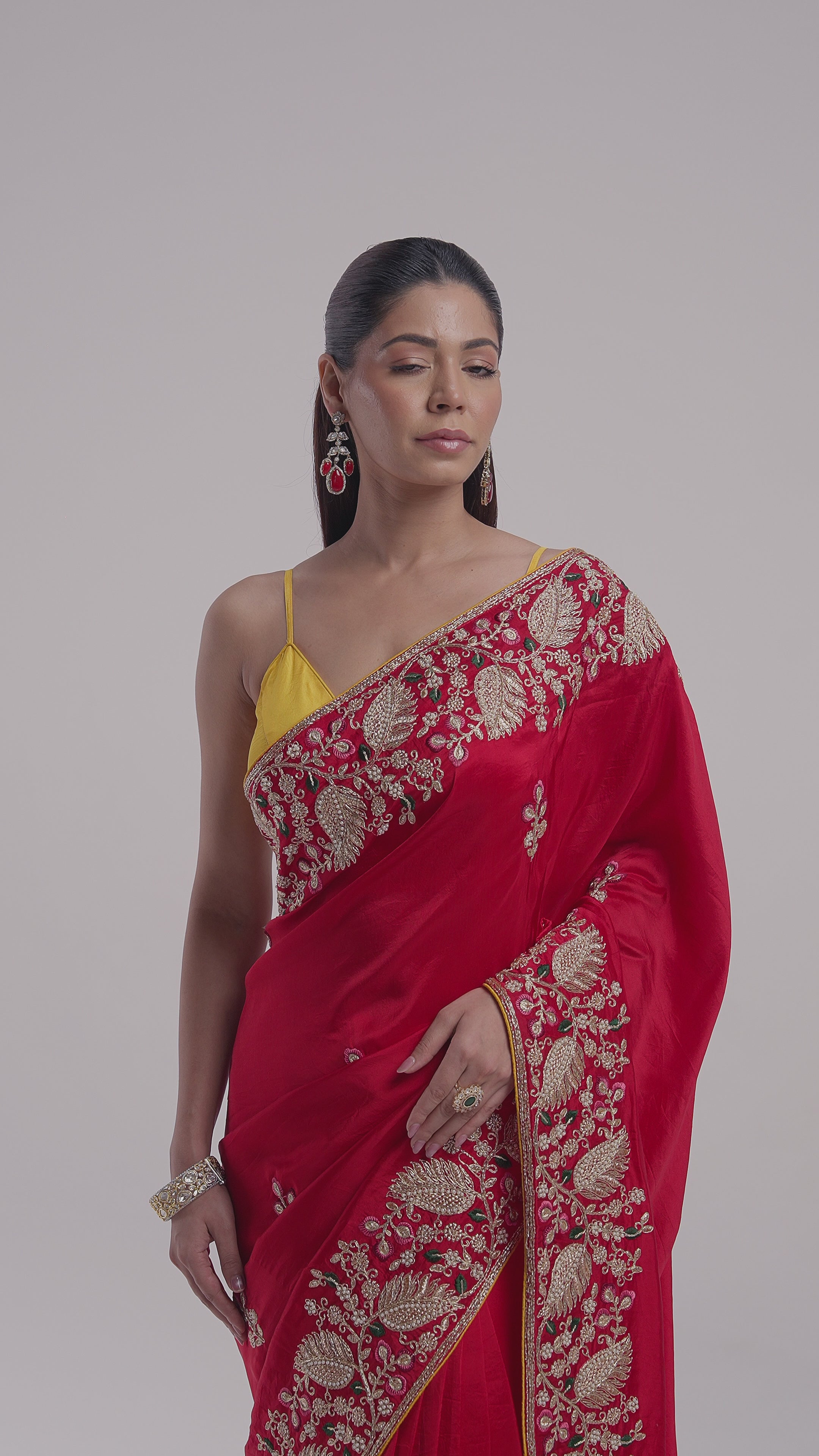 Ruby Red Embellished Satin Silk Drape Saree