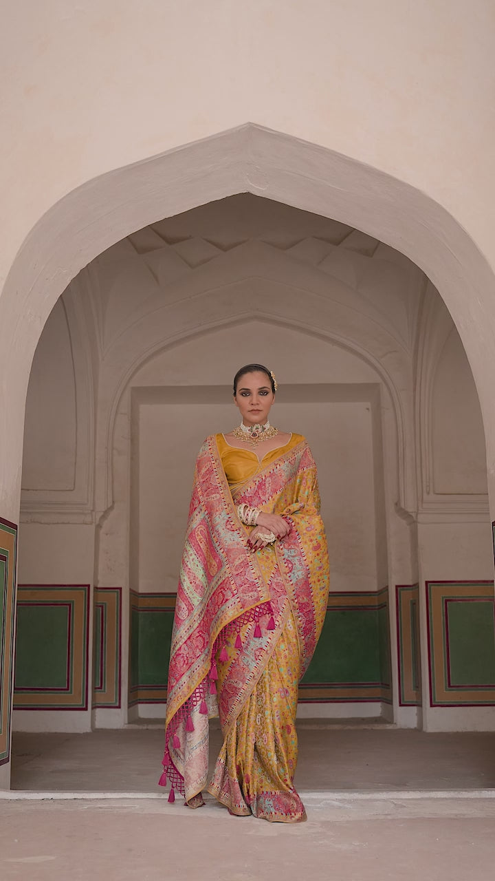 Introducing the Amber Yellow Woven Gajji Silk Saree, crafted with intricate craftsmanship to highlight its luxurious texture. Made with Gajji satin fabric, it offers a smooth drape and luxurious feel. Comes with a matching blouse for a perfectly coordinated look. Ideal for semi-formal wear.