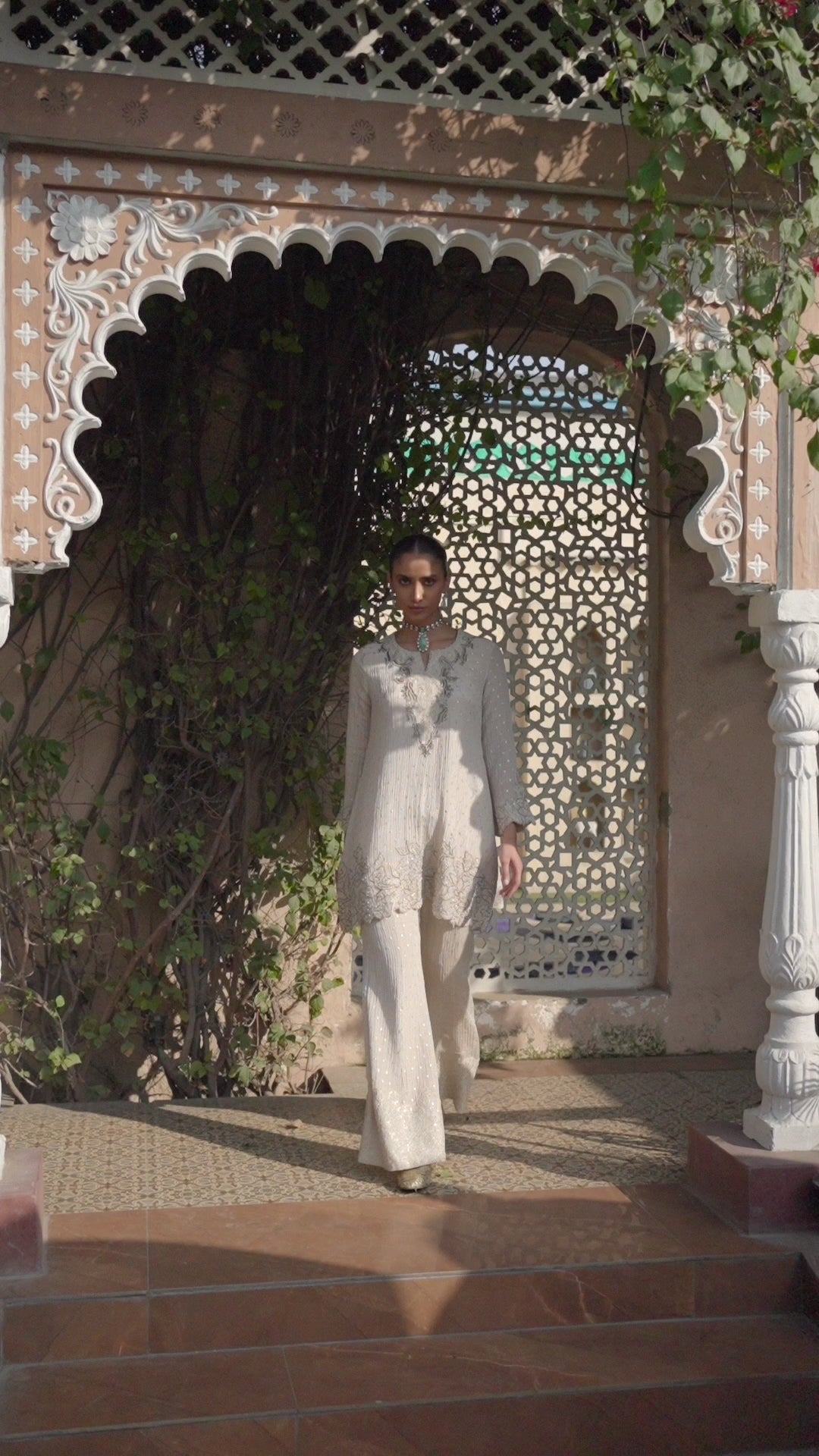 A perfect balance of royal aesthetics and modern cuts, designed for grand celebrations.This Pearl White Shimmer Tissue Organza Silk Palazzo Set exudes timeless elegance and grace. The rich textures and intricate work of sequins, beads and zari on kurta ensure a sophisticated look. Paired with matching palazzo pants. Perfect for weddings, festive occasions, or any special event. This ensemble is a must-have in your collection.