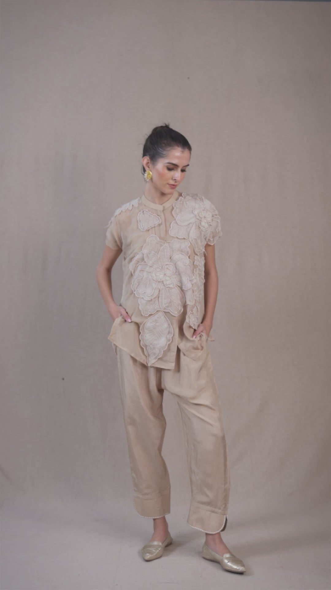 Introducing our Beige Floral Embroidered Organza Silk Co-Ord Set, featuring a tunic crafted with delicate floral motifs. Paired with a matching raw silk crop top and solid pants, it’s perfect for semi-formal wear.