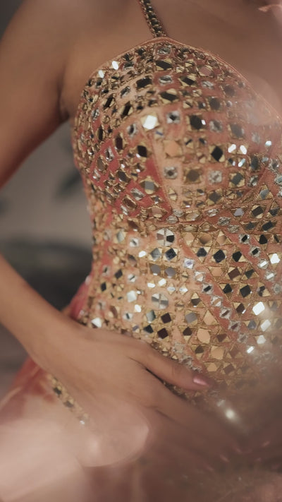 Embrace contemporary charm with this Peach Orange Embellished Premium Silk Lehenga Set. This graceful ensemble features a corset-style top, exquisitely adorned with intricate mirror handwork that adds a touch of festive sparkle. Paired with a beautifully printed pastel peach silk skirt, this lehenga set offers a perfect blend of modern silhouette and traditional elegance ideal for sangeet functions and celebratory occasions.
