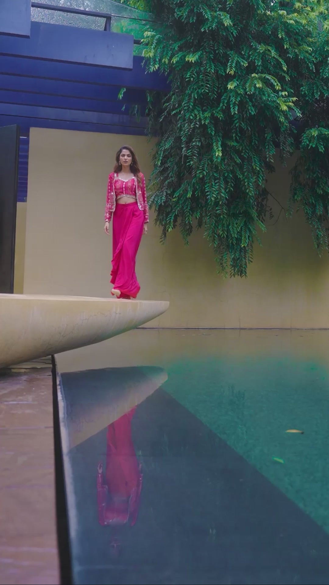 Make a stunning, vibrant entrance in this luxurious Berry Pink Skirt Set. This three-piece ensemble features a dramatically draped and pleated crepe silk skirt and a chic padded crop top inner. The look is completed by a flowing georgette silk jacket, with intricately adorned with rich mirror, thread, sequin, and bead handwork.