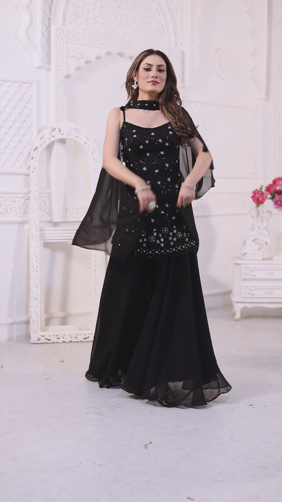Elevate your evening wardrobe with this Black Embellished Tunic Palazzo Set crafted from luxurious georgette silk. The tunic features elegant cut sleeves adorned with intricate cutdana and sequins, offering a refined shimmer perfect for musical nights, sufi gatherings, sangeet ceremonies and sophisticated soirees. Paired with flowing palazzo pants and a distinctive choker-style dupatta, this ensemble combines traditional charm with contemporary style for a graceful, standout look.