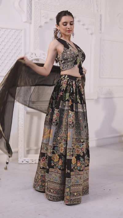 Floral Black Golden Craft Lehenga Set
