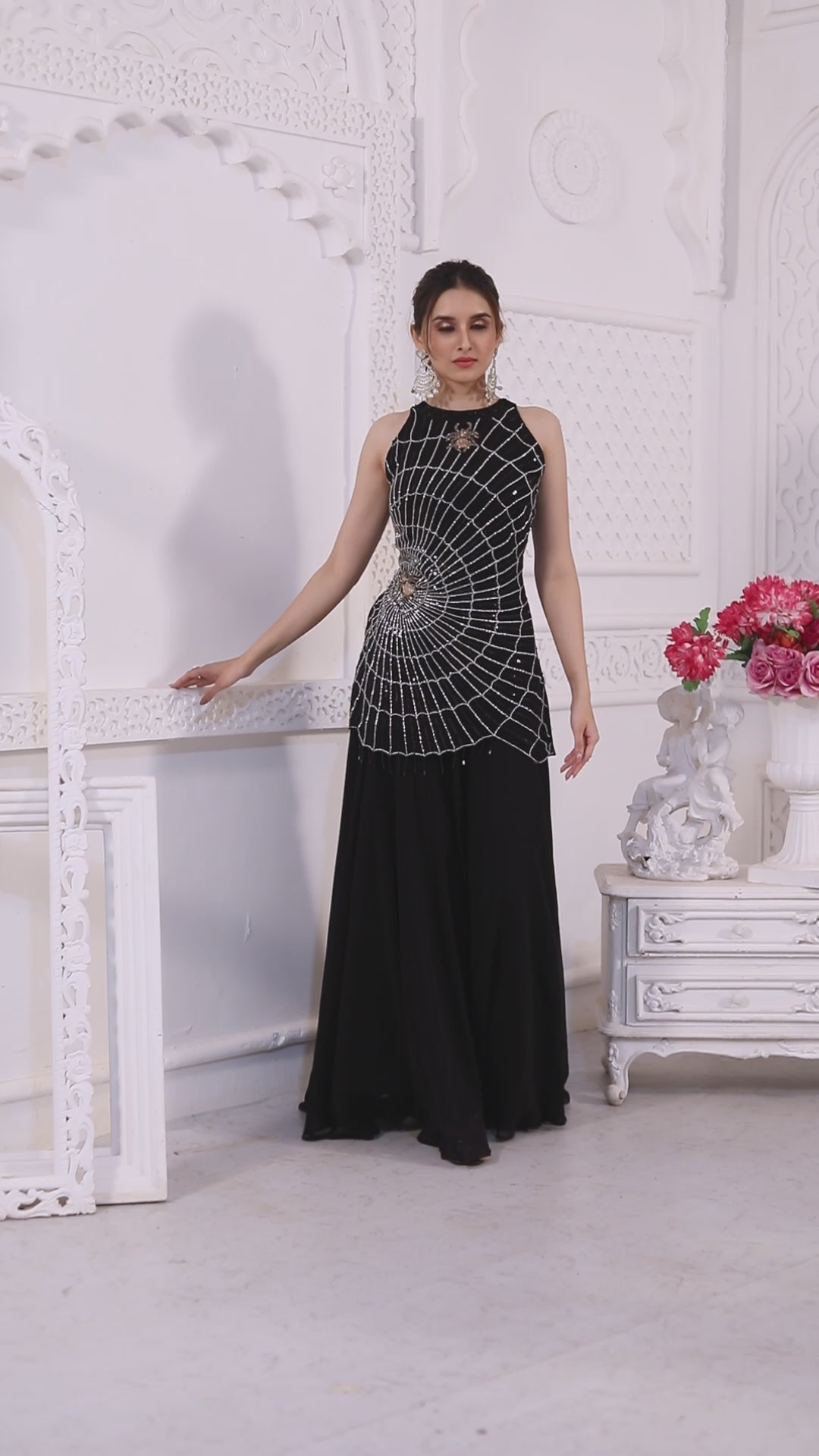 Elevate your evening wardrobe with this Stylish Black Spider Net Tunic & Palazzo Set crafted from luxurious georgette silk. The tunic features cut sleeves and an intricate spider net design embellished with sequins and cutdana, adding a touch of refined sparkle. Paired with elegant palazzo pants, this ensemble is perfect for cocktail nights, parties, music events and sophisticated soirees, combining comfort with standout style.