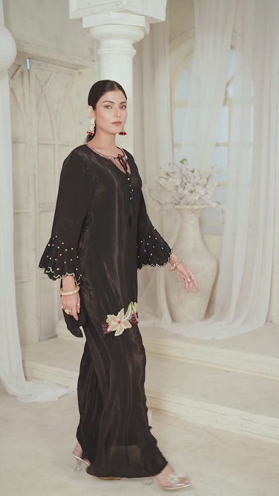 An elegant Black Crepe Silk Palazzo Set featuring a flowing short top with dramatic double-ruffle bell sleeves, richly embellished with multi-colored floral handwork along the lower hemline, paired with matching wide-leg pants.