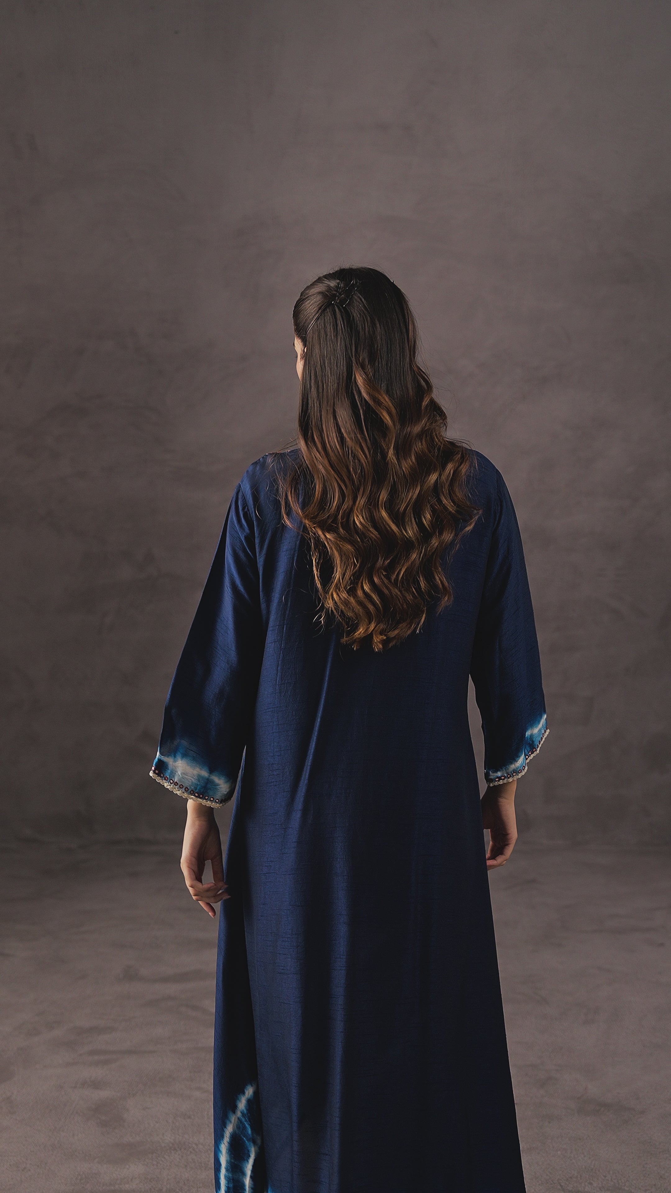 Step into elegance with this Teal Blue Embellished Kurta Set, crafted from lustrous raw silk for a rich texture and graceful drape. The kurta features a striking rust and maroon embroidered yoke, intricately detailed with beads and threadwork for a regal finish. Tie-dye accents along the sleeves and asymmetrical hem add a touch of playful contrast, while pearl edging brings refined charm. Paired with crisp white trousers, this ensemble is perfect for festive gatherings, cultural occasions, or evening soirées. A modern silhouette with traditional craftsmanship, it’s where sophistication meets artistic flair.