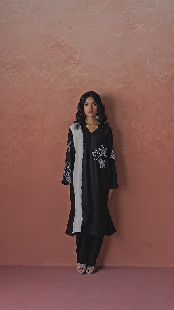 Crafted in luxurious raw silk fabric for a rich and structured silhouette. A sophisticated black kurta set featuring an elegant ombre-dyed panel in ivory.