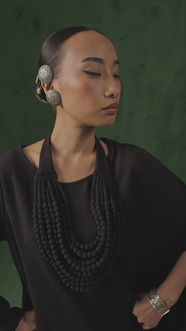 A striking black asymmetrical dress crafted from fluid Spandex Lycra, designed with a dramatic cape sleeve on one side. Its relaxed silhouette flows effortlessly, creating a bold, sculptural presence. Paired with a statement fabric necklace, this piece blends minimalism with avant-garde elegance. Perfect for making a powerful, artful impression.