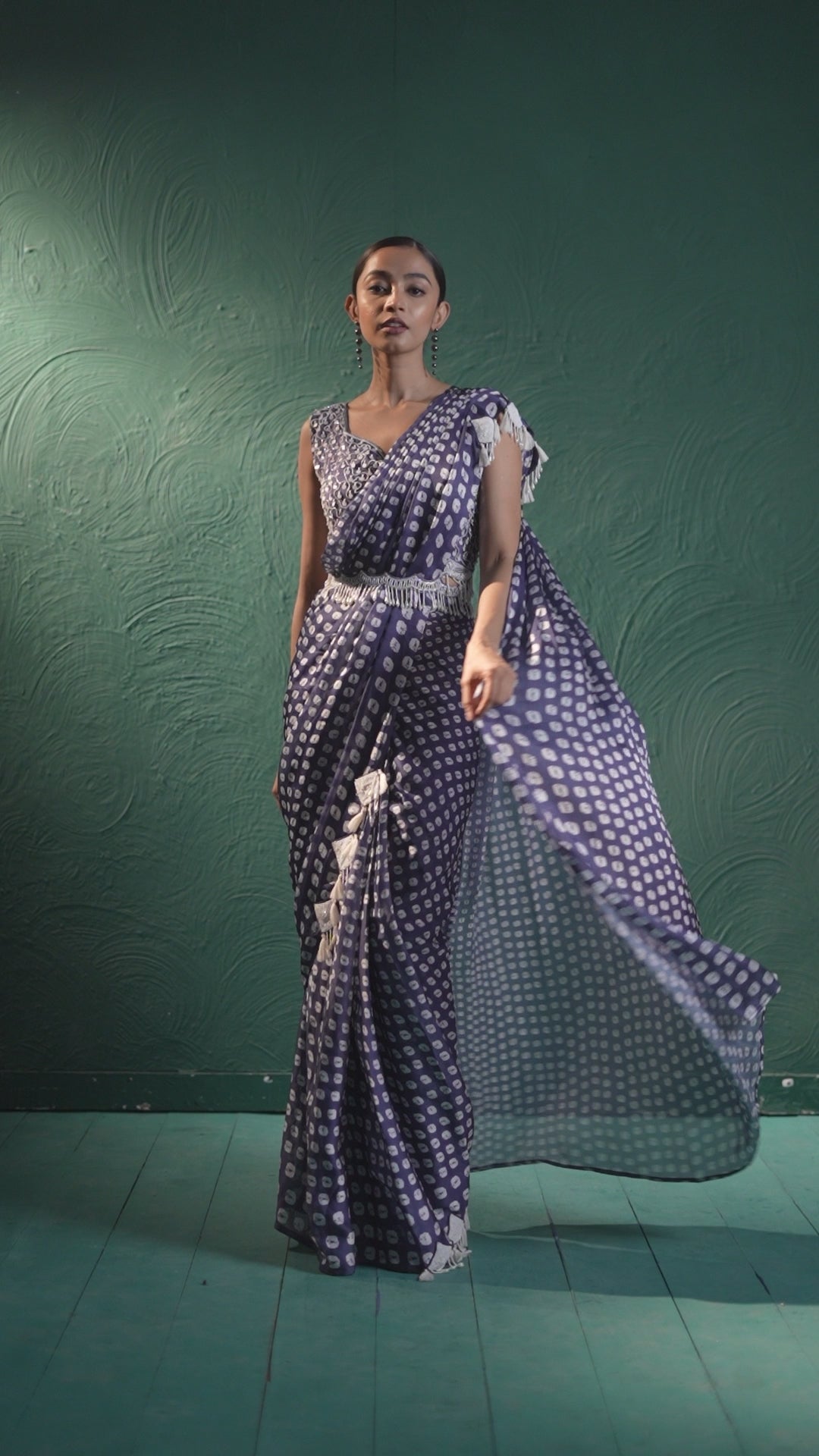 Elevate your style with the Blue Bandhani Satin Silk Saree. This beautiful saree features a classic Bandhani print with delicate white embroidered borders and white dotted patterns. Complete with a matching ready-stitched blouse embellished with intricate handwork and a detailed waist belt for a structured silhouette. Perfect for adding a touch of modern elegance to your festive occasions.